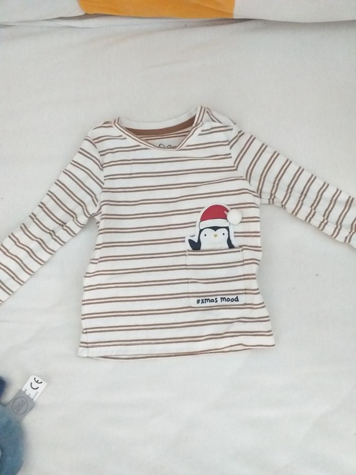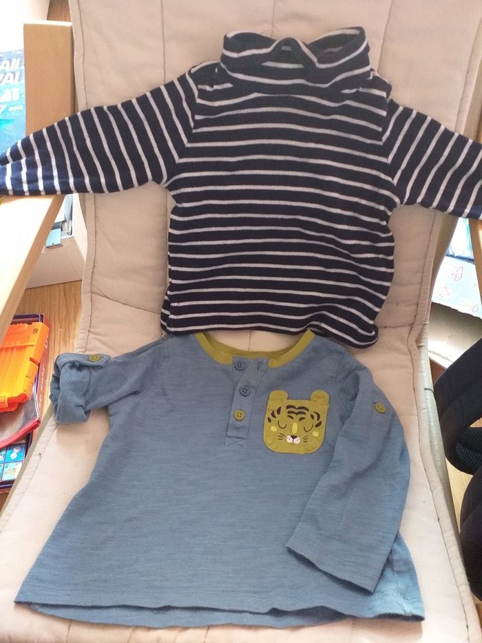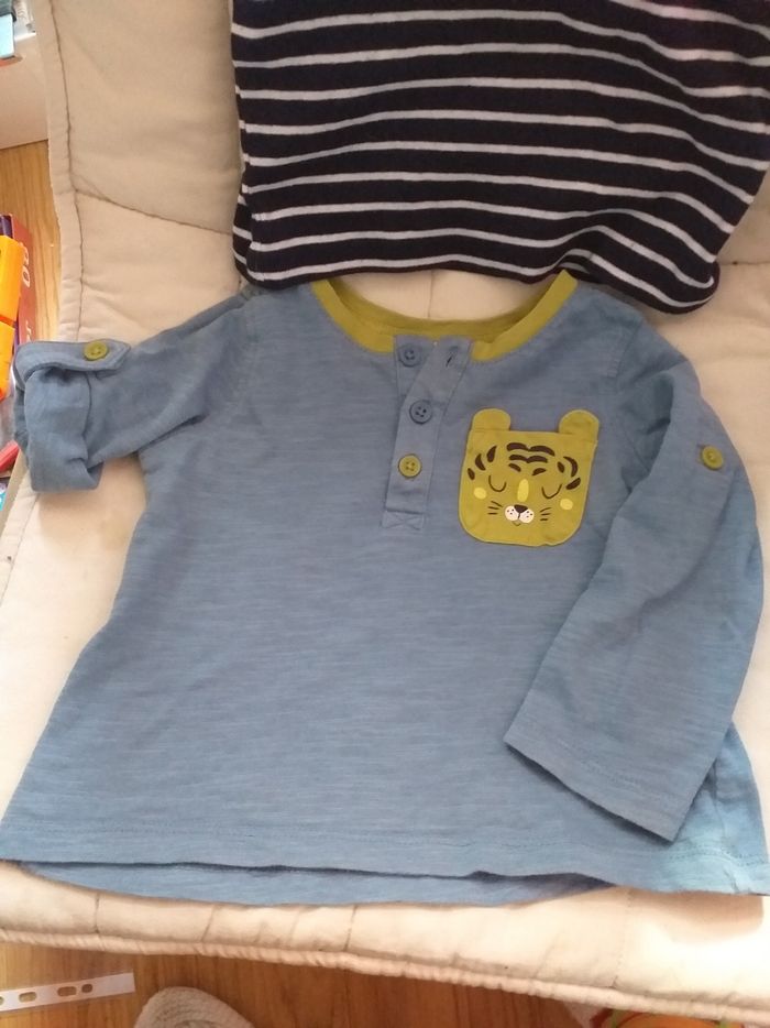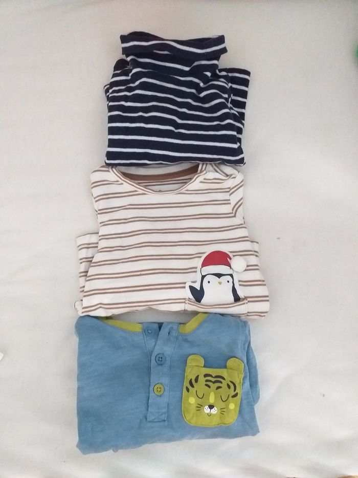 Lot de 2 hauts DPAM. Un col roulé et un tee-shirt manches longues mais qu'on peut retrousser pour faire des manches 3/4. + un haut C&A à rayures et manches longues. Taille: 74 cm ou 12 mois En très bon état.