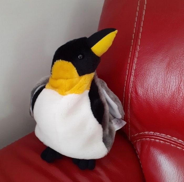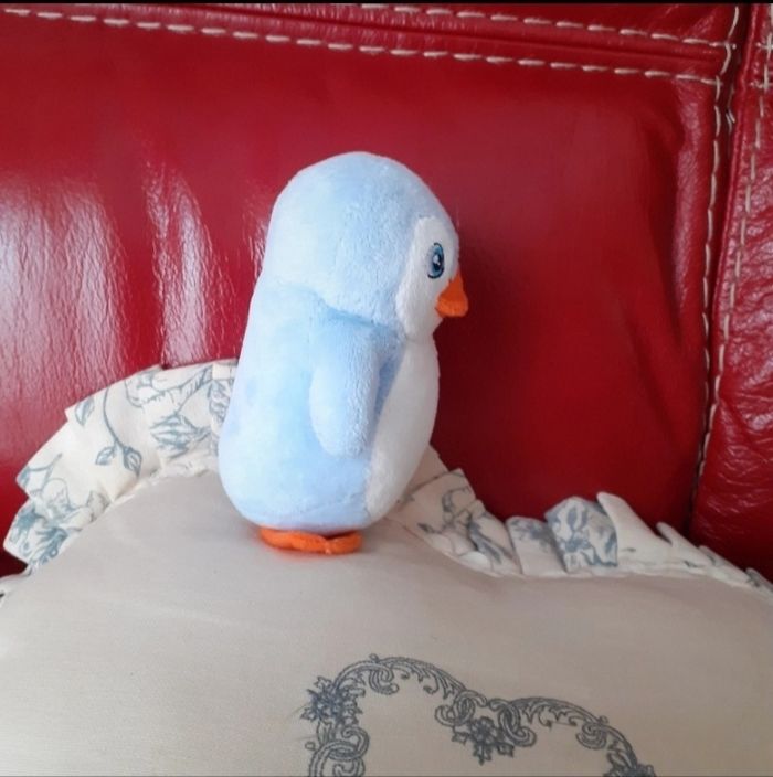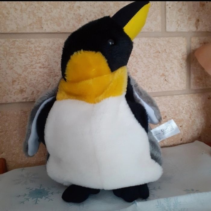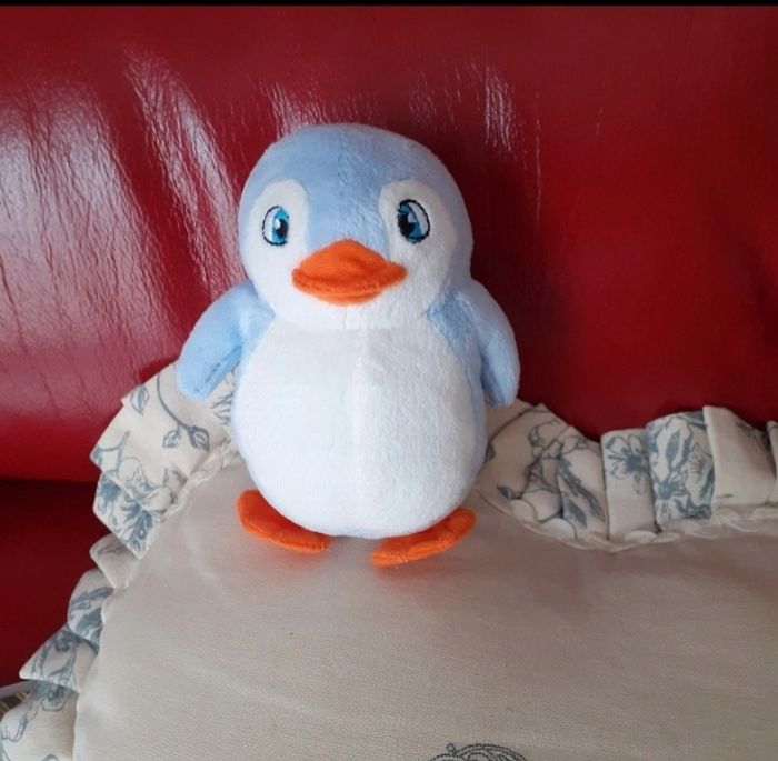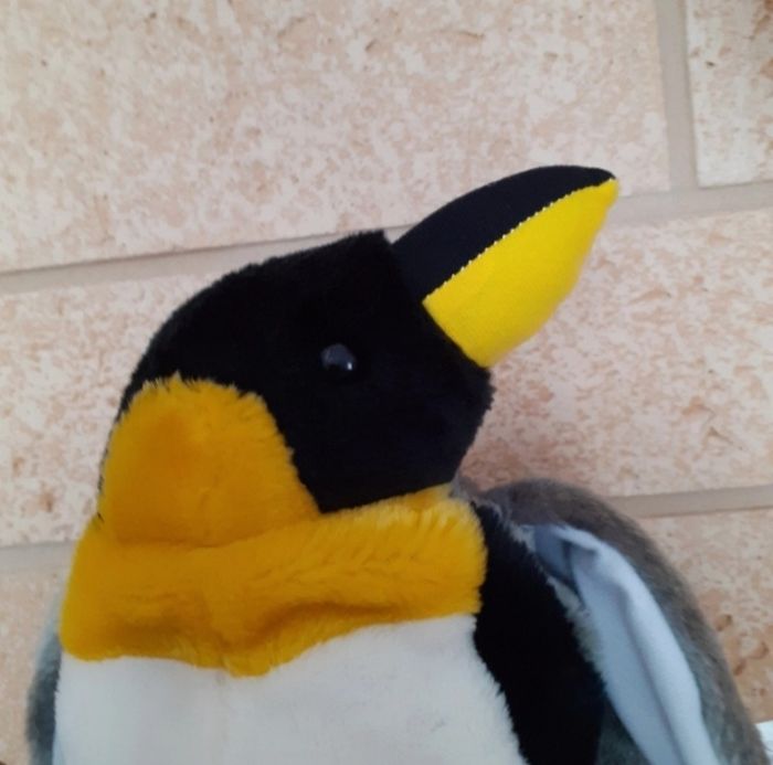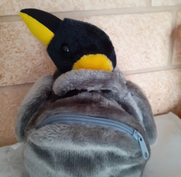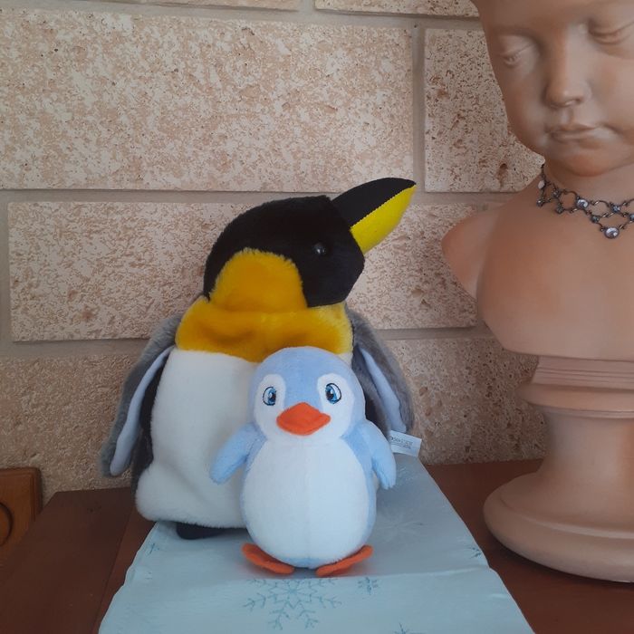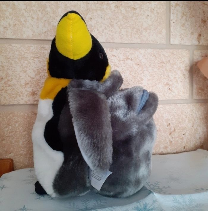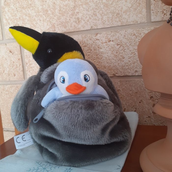 Le lot comprend : 1/ Peluche-pochette Pingouin rembourrée; yeux boutons; coloris noir-blanc-gris-jaune. Pochette zippée au dos pour ranger le doudou ou autre chose. Transport facilité par 1 petite poignée. Hauteur totale de cm.  Lavable à 30° + 2/ Peluche-Doudou Bébé Pingouin entièrement rembourrée; yeux brodés; petites billes en intérieur pour faciliter la position debout. Coloris bleu ciel-blanc-orange. Hauteur totale de 11 cm  // voir photos pour détails