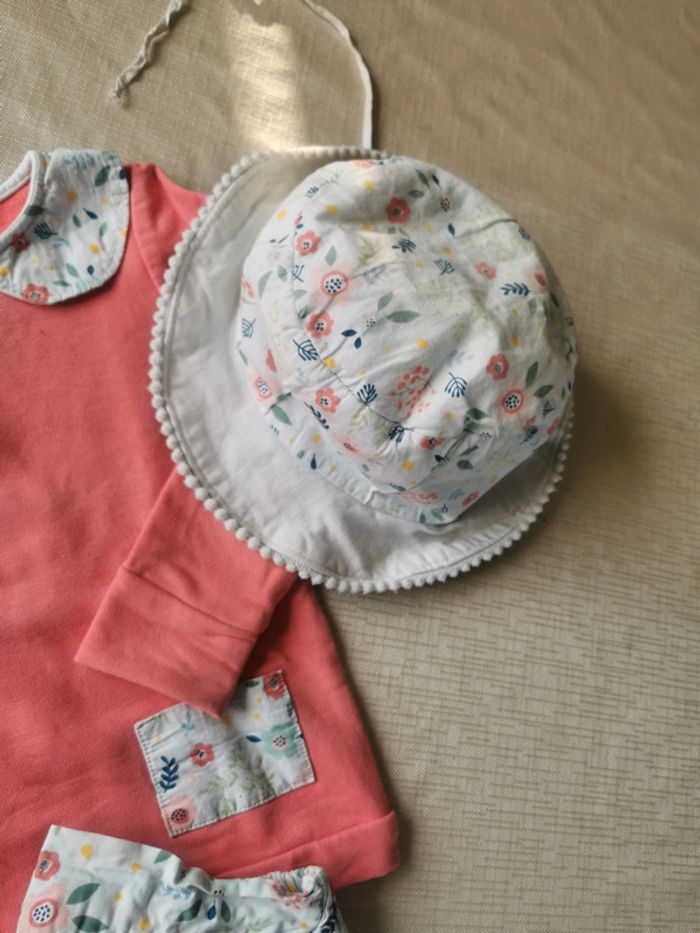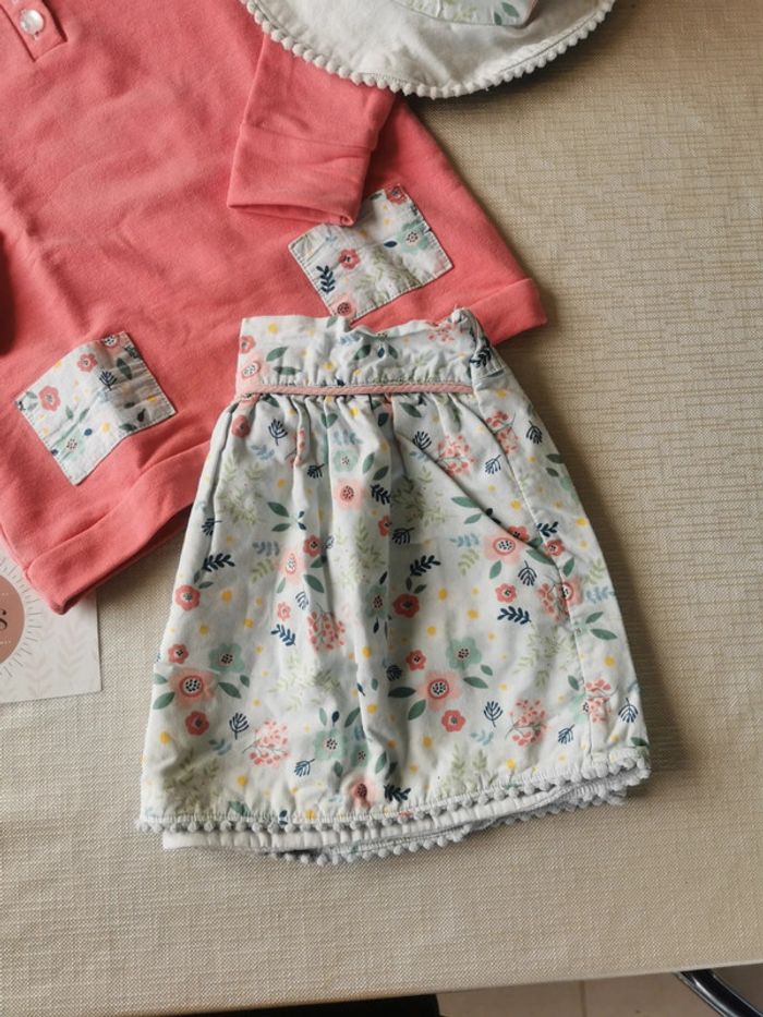 Fait main Tout est assorti ! Chapeau réversible Sweat molleton corail avec détails poches et col claudine Jupe avec pompons (a été bcp portée mais tjs jolie !) Si maman fait un 36/38, j'ai fais un sweat de la même couleur et une jupe avec le même tissu fleuri. Je peux les vendre en plus pour faire unatchy matchy 🥰.