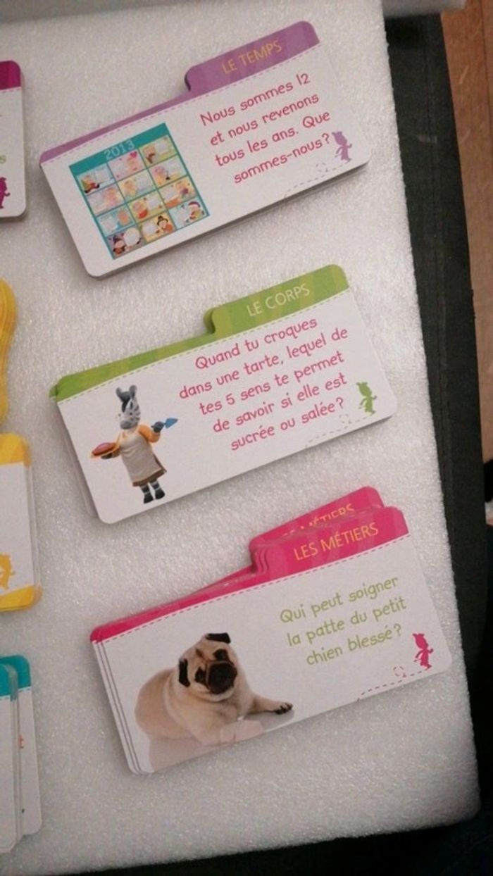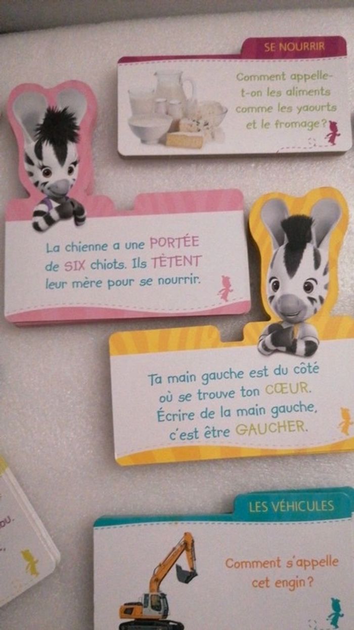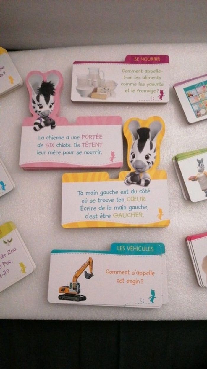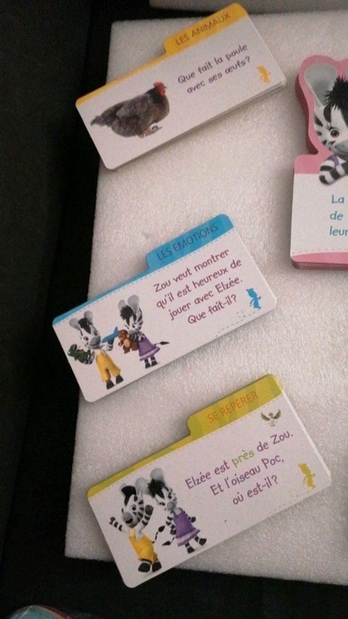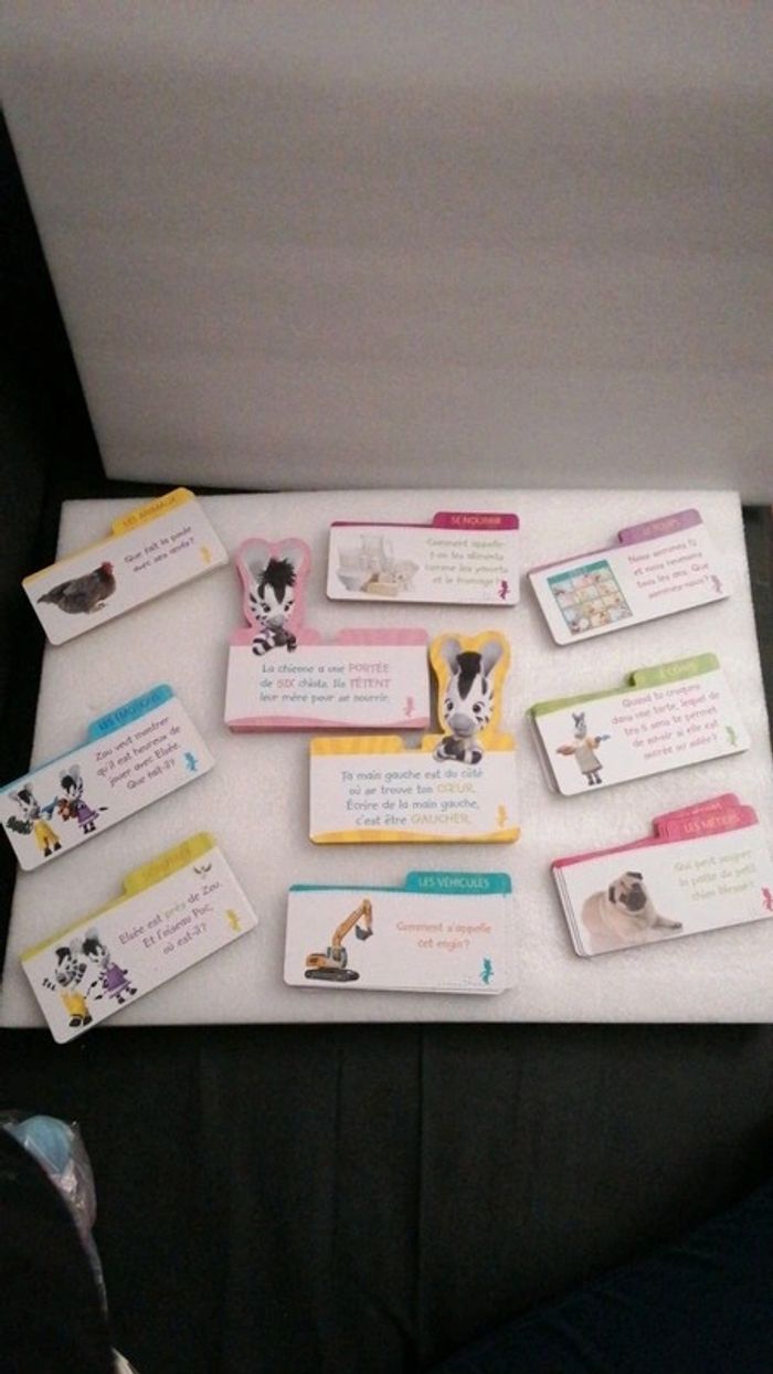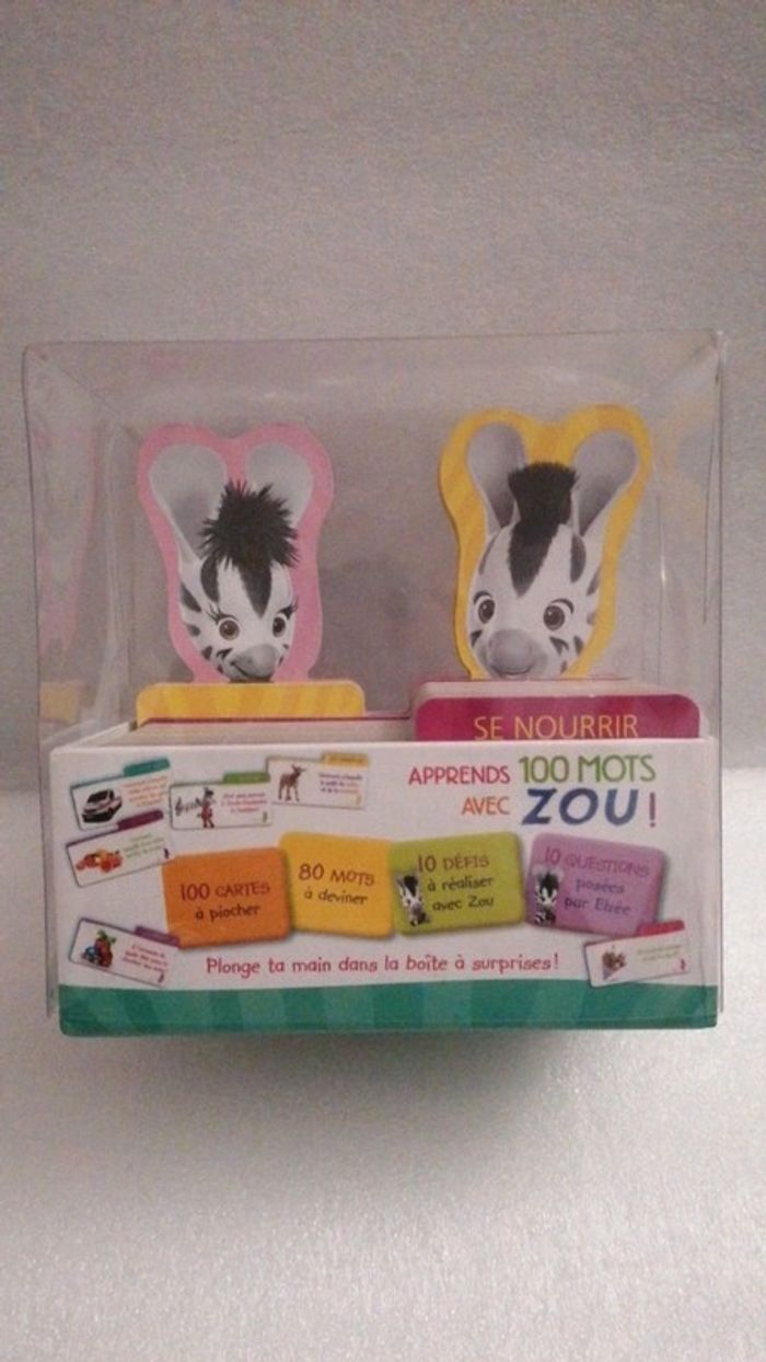 #jouetstelpha Coffret Zou comprenant 100 cartes pour aprrendre des mots en s amusant. L ensemble est dans un très bon état général à l exception de ⤵️ ⚠️attention quelques cartes sont très légèrement abîmées, le couvercle plastique est également abîmé 😞(cf dernières photos) 💖💖Une boîte de 100 cartes , dont 20 en forme de Zou et d’Elzée : - 80 cartes thématiques pour apprendre des mots fondamentaux, mais aussi drôles, insolites et originaux. D’un côté la question avec le mot à deviner et de l’autre la réponse avec une illustration. - 10 cartes Zou avec des défis à relever pour apprendre à imiter des animaux, des gestes, etc. - 10 cartes Elzée avec des questions faciles et ludiques. 8 thèmes pour enrichir le vocabulaire des tout-petits : - Les animaux - Les transports - Les 5 sens - Les actions - La nature - Le corps - Les émotions - Se repérer