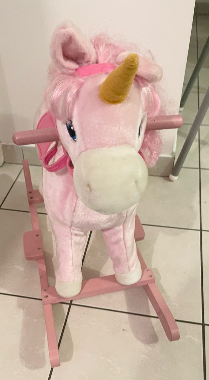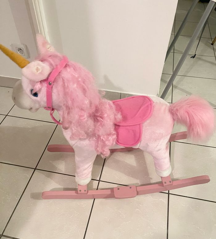 Vend licorne à bascule en bois. Chante et remue sa queue lorsqu’on appuie sur ses oreilles. A venir récupérer a Athis Mons 91200