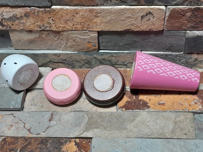 Glace en bois à scratchs. Accessoire pour dînette bon état. Vendu comme sur les photos. Consultez mes autres annonces, création de lot possible sur simple demande .🙂