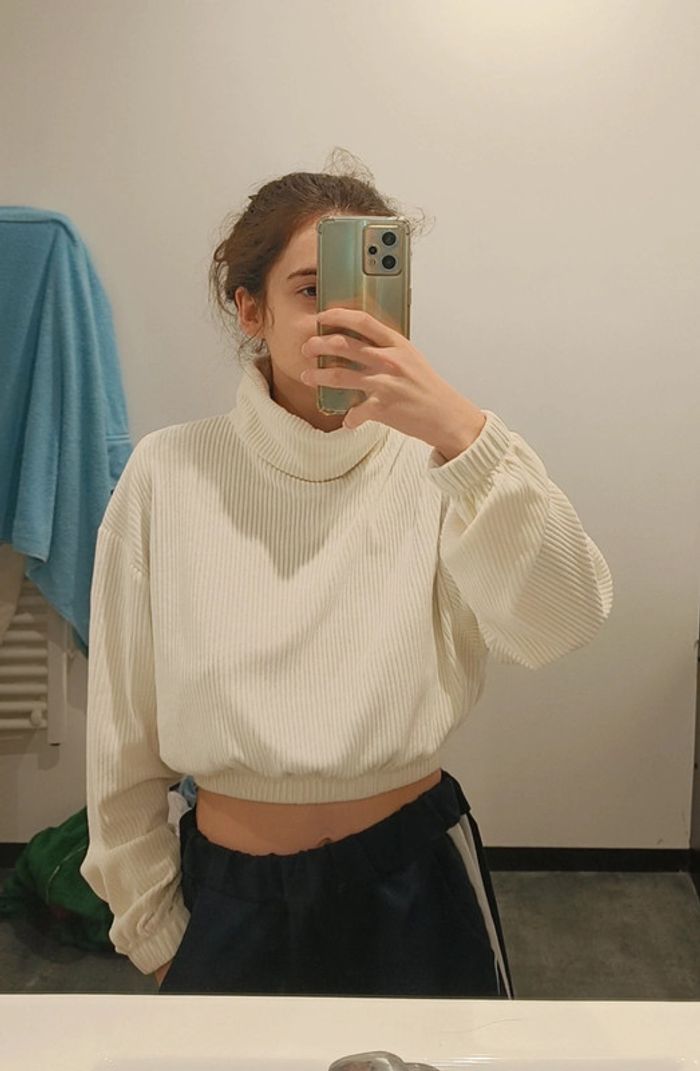Pull blanc Bershka taille S Col montant, coupe courte, crop top Tres bon état pas de défaut