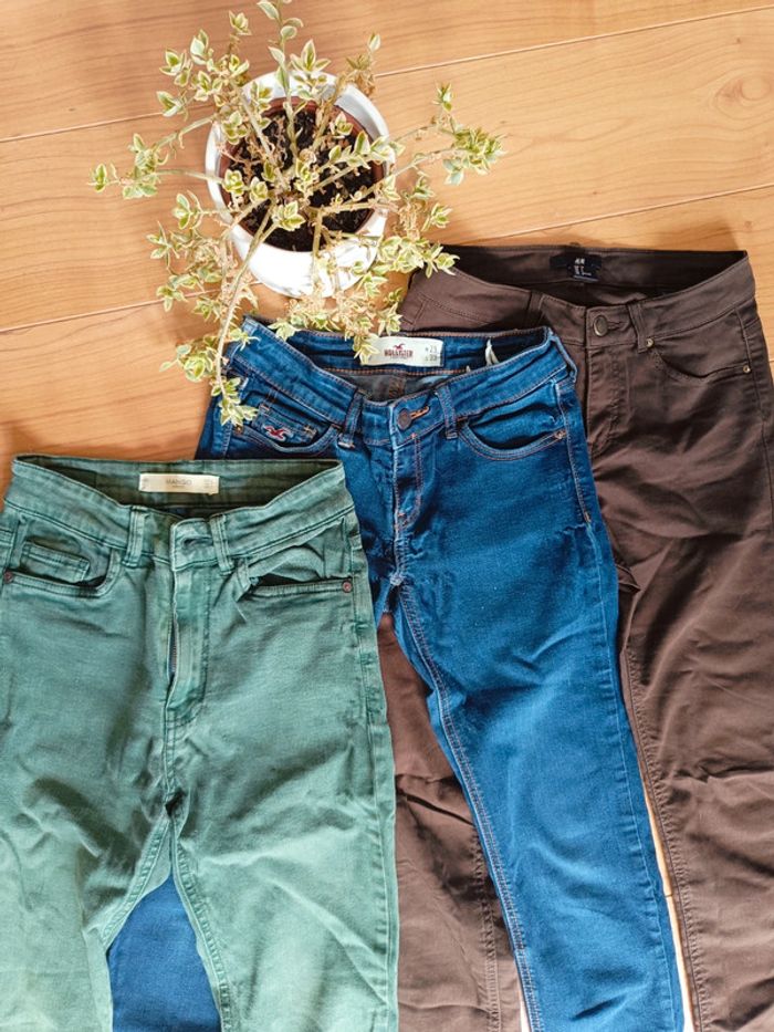 Taille 34 Le vert vient de chez Mango, le bleu et un hollister (il a quelques fils tirés d'où le prix) et le marron est un hm Le Hollister est un peu abîmé mes autres sont en très bon état