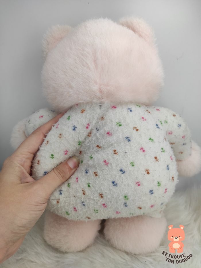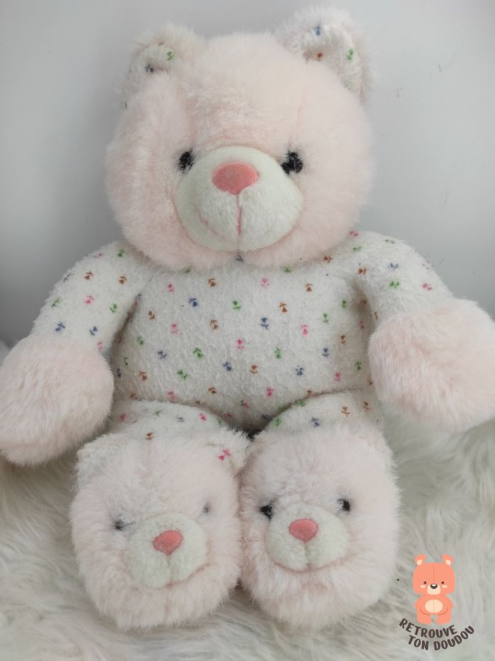 🧸 Peluche Ours rose pâle et blanc à motifs fleuri avec chaussons roses en tête d'ours, vintage (fin 1980'), peut-être de marque Impexit 📏 Dimension : 30 cm environ ✨ Occasion, bon état dans son jus 🧼Vendu en l'état, non lavé 👀 Vous achetez le doudou que vous voyez sur les photos.