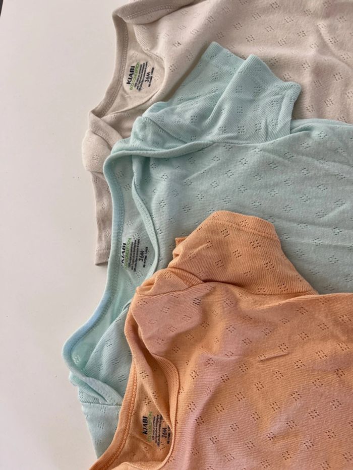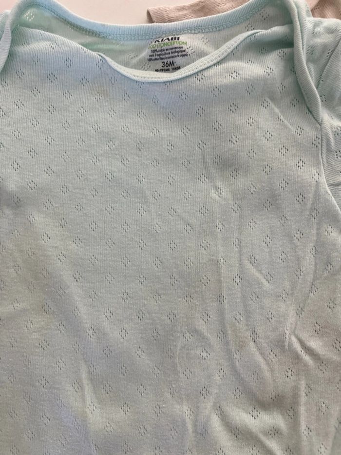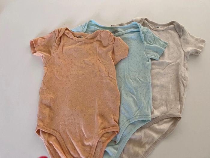 Lot de 3 bodies à manches courtes. Le bleu a de légères taches et le blanc aussi mais uniquement à la fermeture en bas : cf photos.