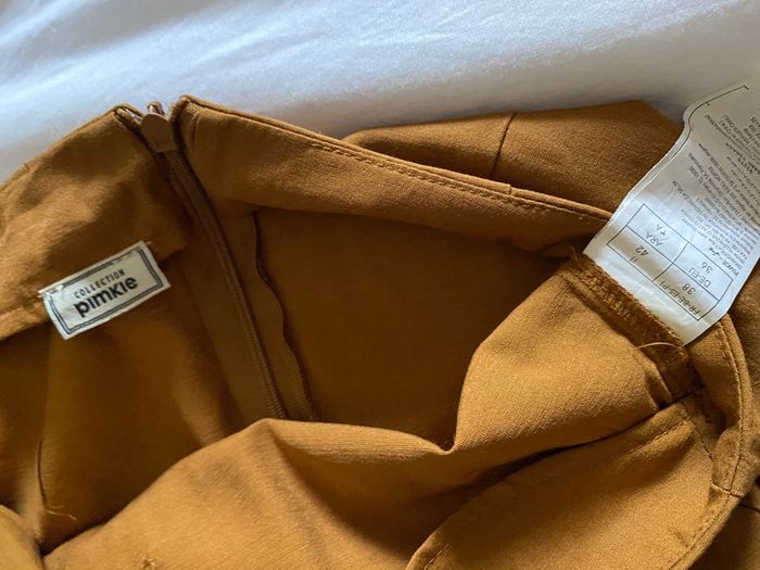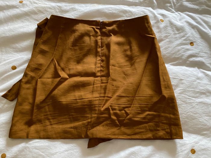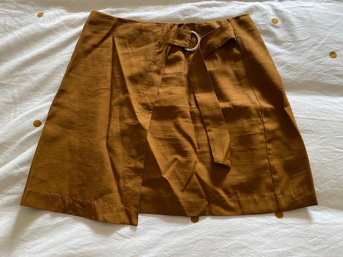 Jupe camel qui se ferme avec une fermeture éclair à l’arrière et ceinture accessoire devant. Très bon état, peu portée.