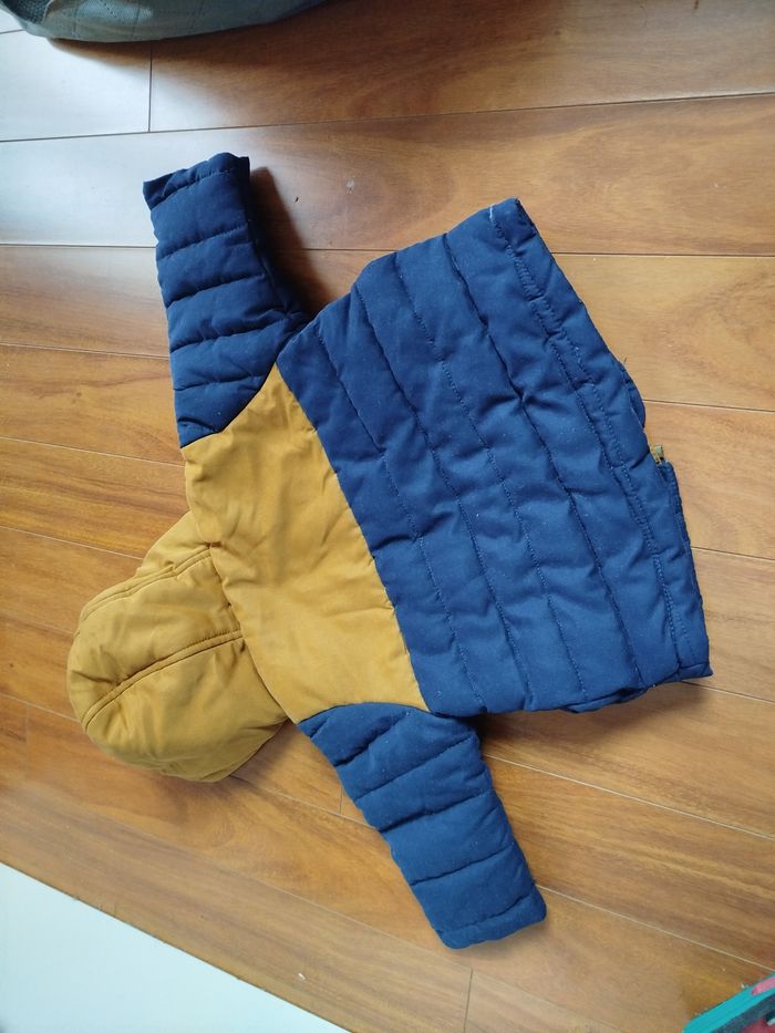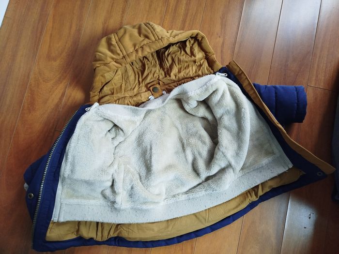 Manteau Vertbaudet 3 en 1 6mois 67cm bleu marine/moutarde et polaire beige Le manteau peut être porté seule La partie polaire aussi Ou les deux ensembles Quelques bouloches sur les parties élastiques de la partie polaire #hiver #automne #automnehiver #polaire #chaud #tientchaud #tient_bien_chaud #tientchaudlhiver