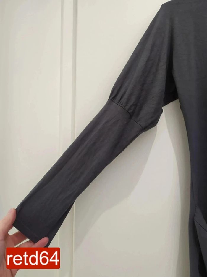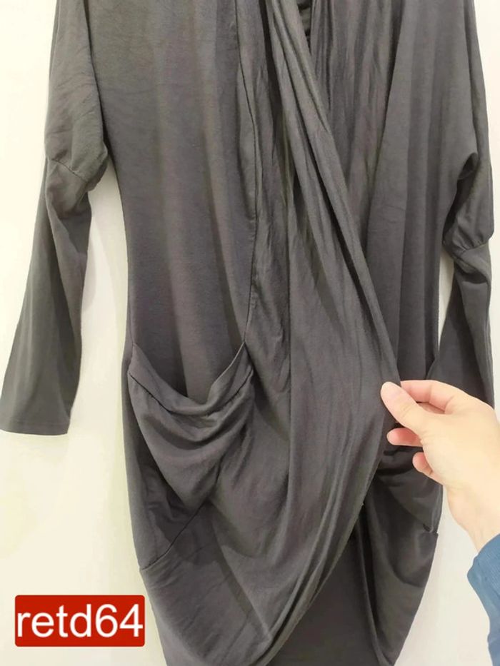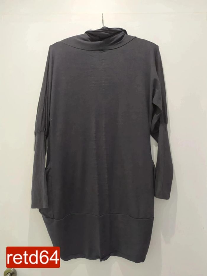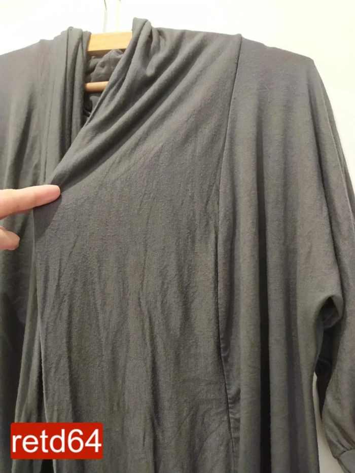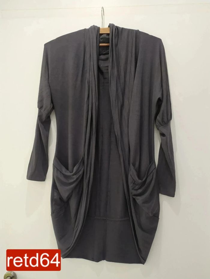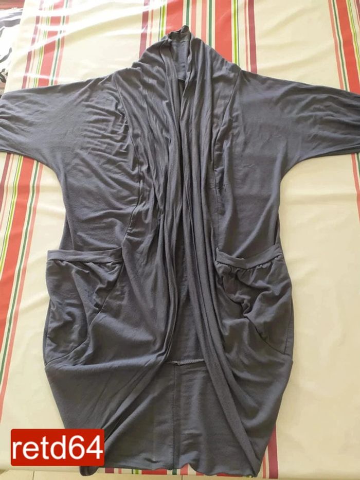 veste longue gris foncé matière fluide et agréable ne se ferme pas manches serrées taille unique largeur aux aisselles : 48 cm hauteur : 81 cm longueur manche dessus : 60cm Pour voir toutes mes annonces de cette catégorie, suivez ce lien : #RetDadulte