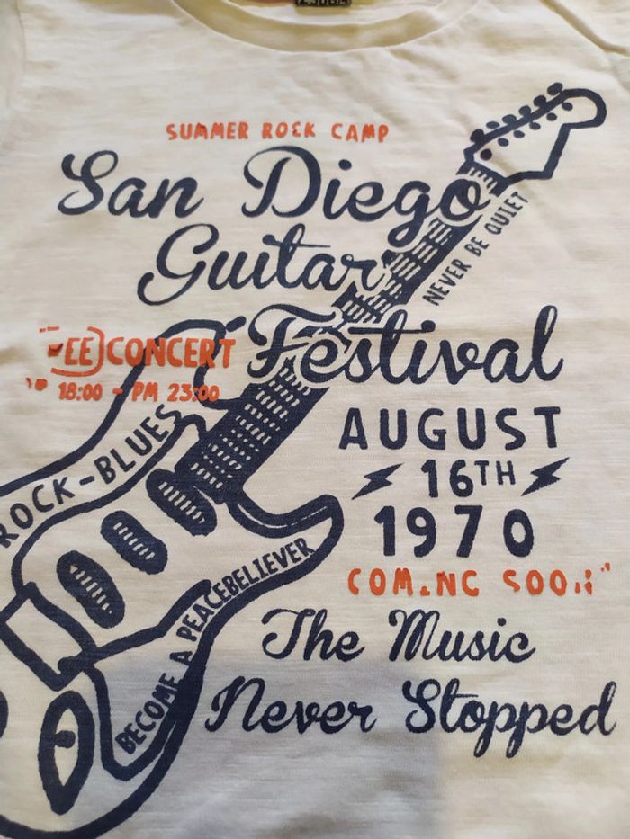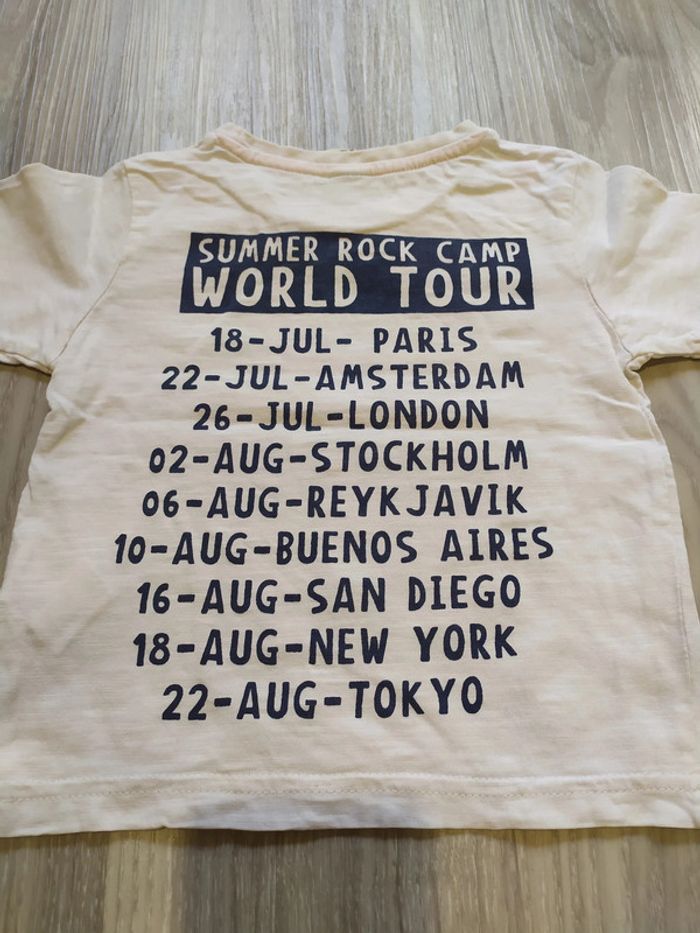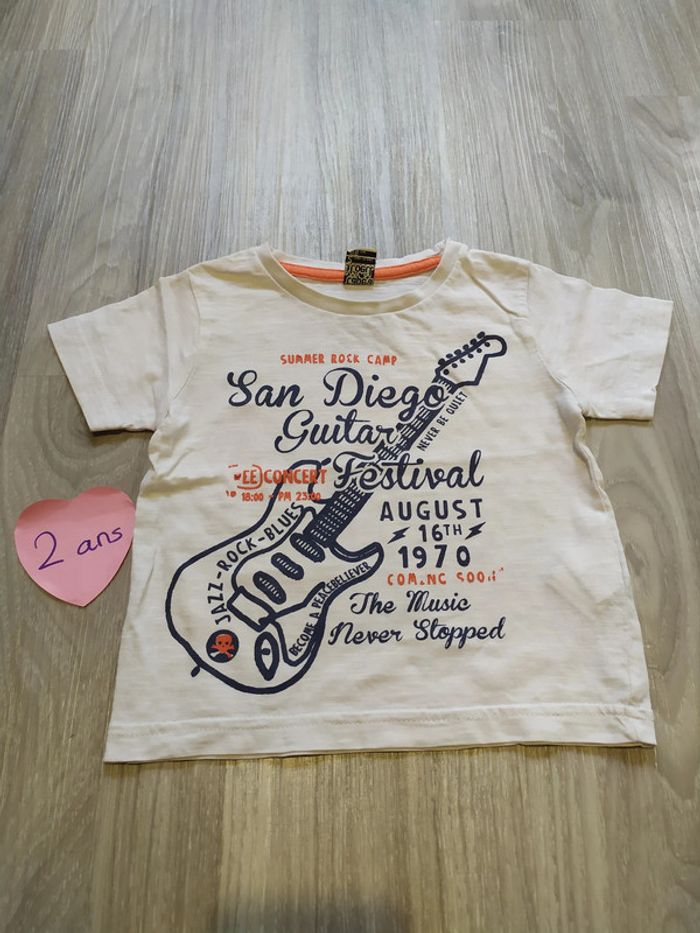 joli t-shirt manches courte 2 ans blanc écriture marine et orange (certaines lettres orange commencent à sauter mais ça donne un style) dessin guitare "San Diego guitar" au dos les dates de tournée Pour voir toutes mes annonces de cette catégorie, suivez ce lien : #RetDgarçon2ans