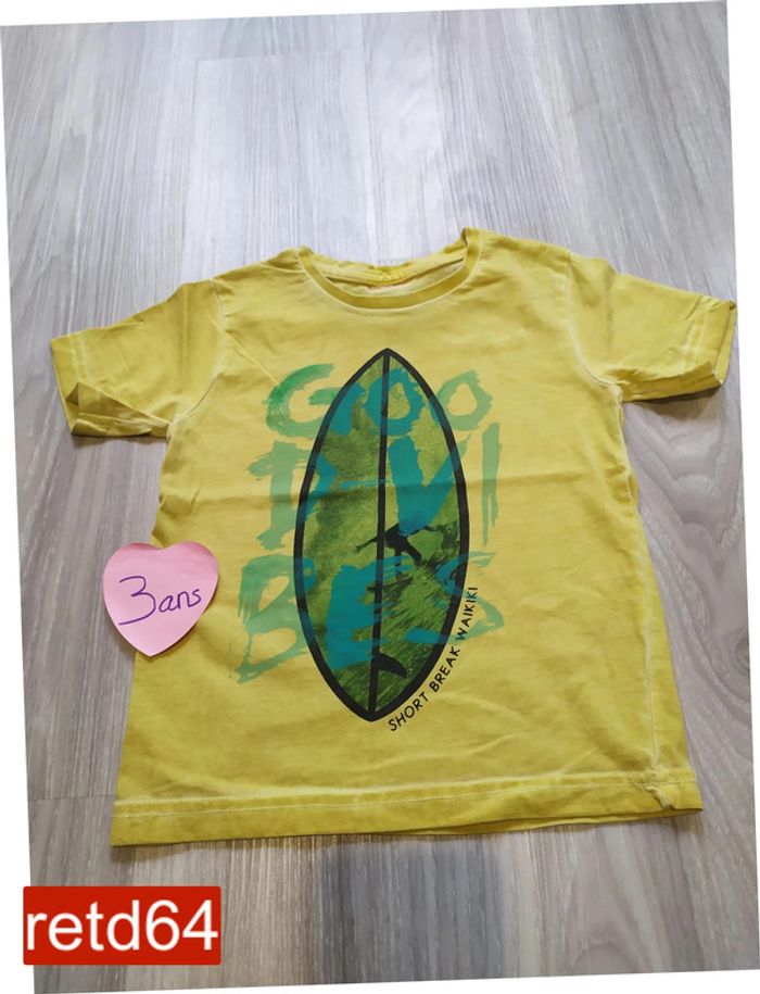 t-shirt manches courte pas d'étiquette (coupée) mais correspond à du 3 ans joli jaune un peu marbré motif planche de surf Pour voir toutes mes annonces de cette catégorie, suivez ce lien : #RetDgarçon3ans