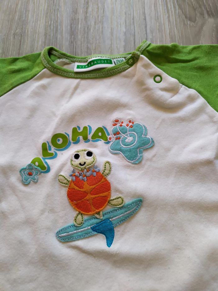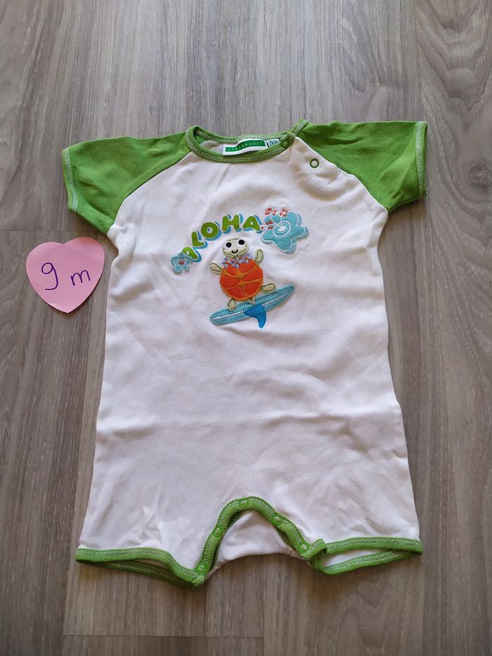 combishort manches courte 9 mois blanc et vert motif grenouille "aloha" devant boutons pression à l'épaule et à l'entrejambe Pour voir toutes mes annonces de cette catégorie, suivez ce lien : #RetDgarçon9mois