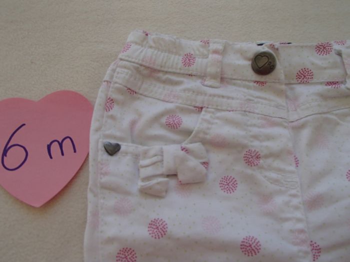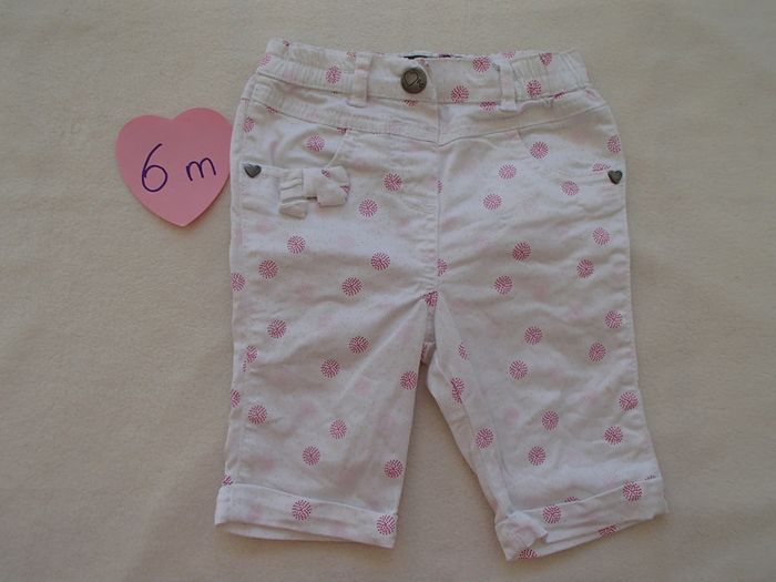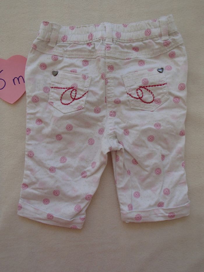 pantalon léger blanc à motif rose et tout petit points vert 2 poches devant dont une avec un noeud décoratif 2 poches arrière avec broderie bouton pression et fausse braguette taille élastiquée Pour voir toutes mes annonces de cette catégorie, suivez ce lien : #RetDfille6mois
