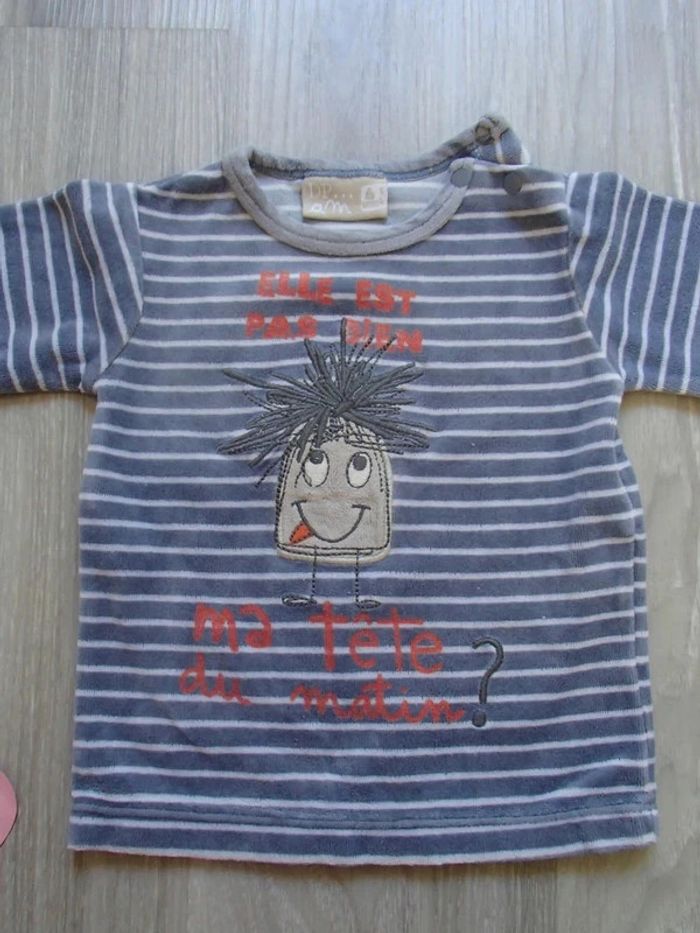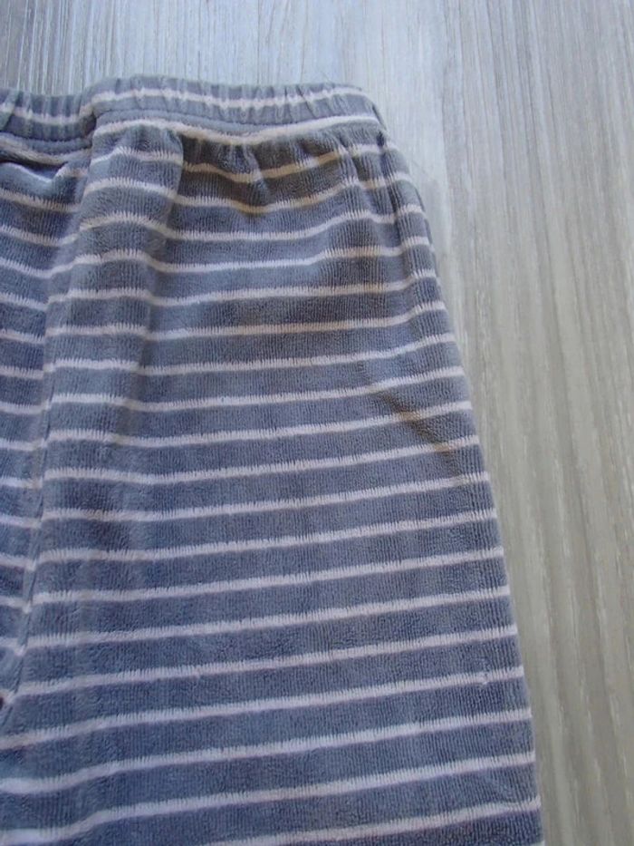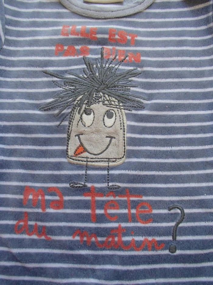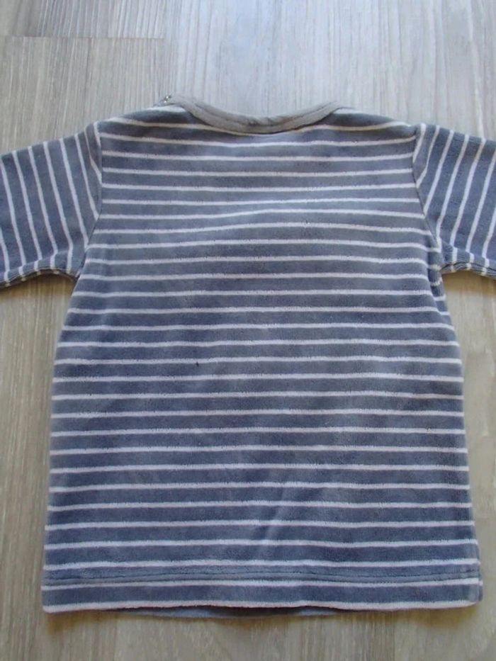 pyjama velours 2 pièces 6 mois rayé bleu dessin devant 2 boutons pression épaule bas avec pied intégré possibilité de les attacher ensemble par boutons pression Pour voir toutes mes annonces de cette catégorie, suivez ce lien : #RetDgarçon6mois