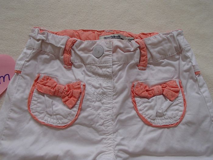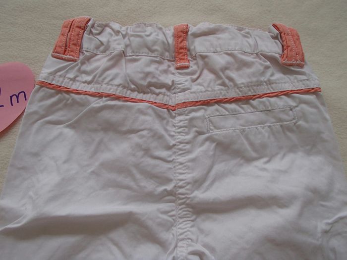 pantalon léger blanc avec touche orange clair à pois blanc taille réglable bouton pression + fausse braguette 2 poches devant avec petit noeud + 1 poche derriere Pour voir toutes mes annonces de cette catégorie, suivez ce lien : #RetDfille12mois