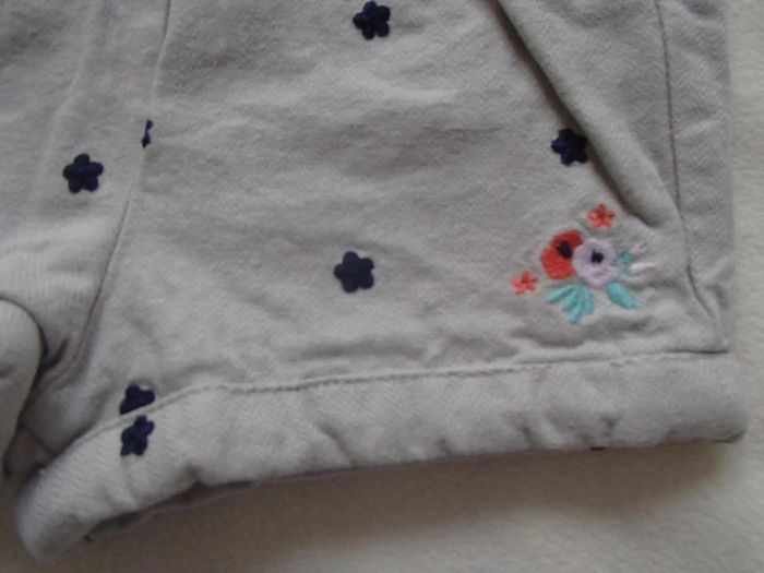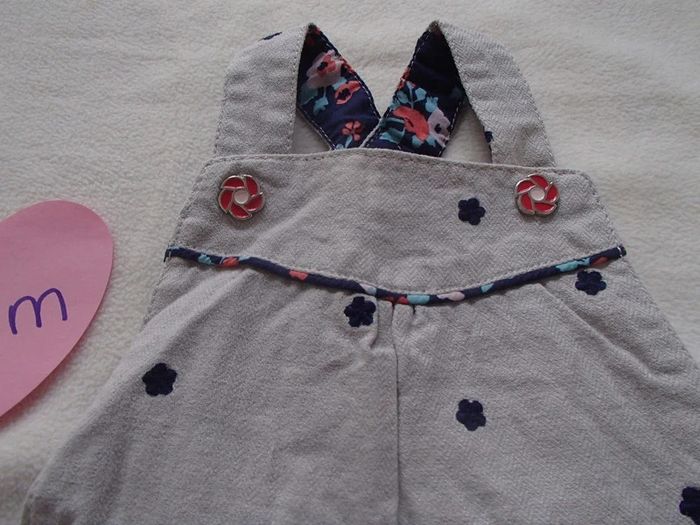 salopette short 6 mois beige motif fleurs bleu marine doublé en tissu bleu marine à fleurs bretelles à boutons pression réglables en longueur 2 bouton pression de chaque coté à la taille taille réglable 2 poches au fesses Pour voir toutes mes annonces de cette catégorie, suivez ce lien : #RetDfille6mois