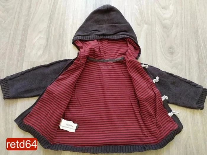 grosse veste chaude à capuche 9 mois extérieur en laine gris foncé intérieur en coton rayé gris foncé et rouge fermeture par 4 boutons Pour voir toutes mes annonces de cette catégorie, suivez ce lien : #RetDgarçon9mois