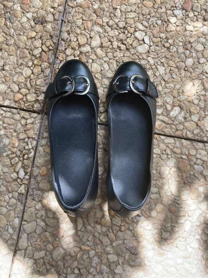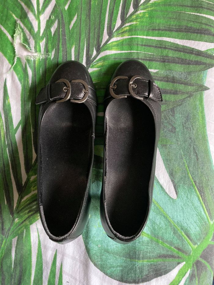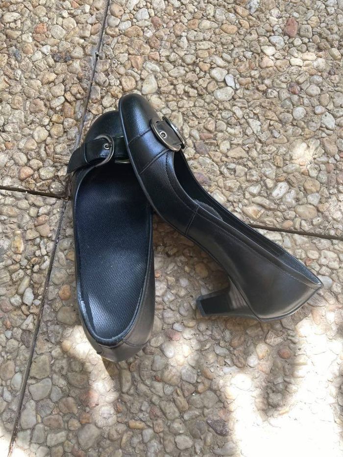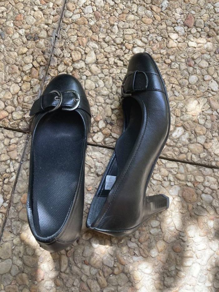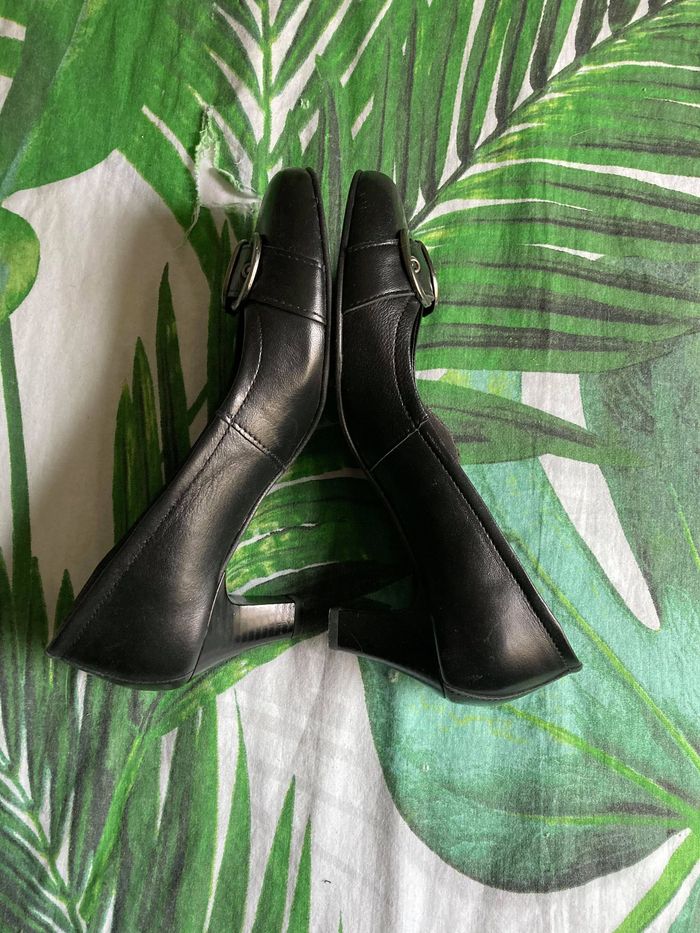 Paire d'escarpins pas très hauts, noire, avec une boucle sur l'avant en décoration. Quasiment jamais portés, en très bon état. Je crois que c'est du cuir mais pas sûr. La marque n'est plus visible.