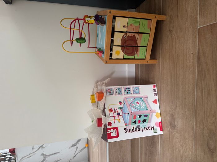 Maxi Looping avec 5 activités : une horloge pour apprendre l’heure, puzzles rotatifs pour l’apprentissage de la logique, 3 labyrinthes pour le développement de la dextérité, 4 cubes à encastrer pour apprendre les formes et les couleurs, un boulier pour que votre enfant développe sa concentration et sa motricité. Le cube est complet dans son carton d’origine en bon état mais quelques traces d’usure. Le puzzle rotatif a une petite particularité une des pièces est à l’envers (3ème photo).