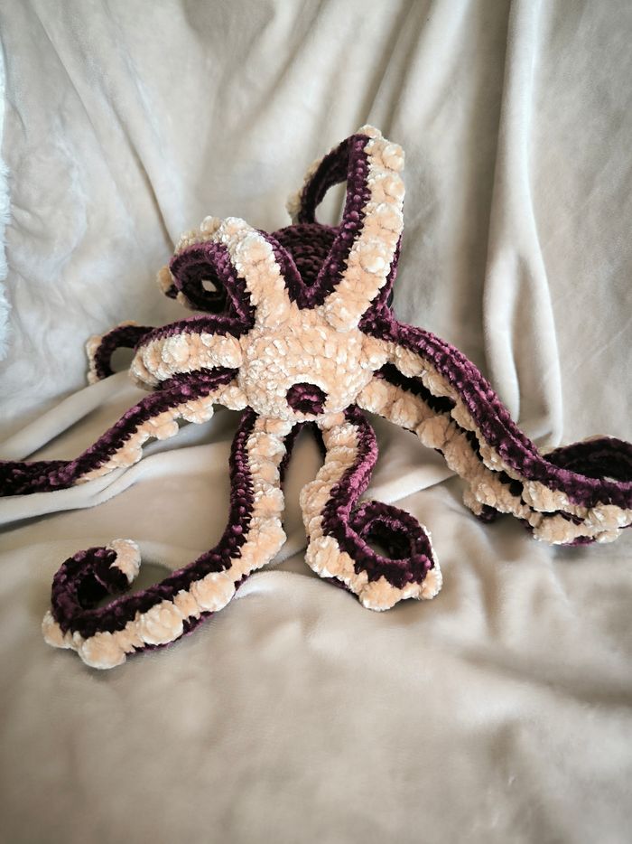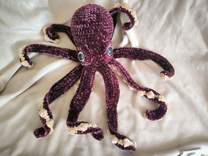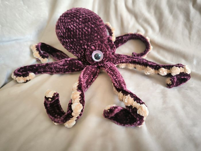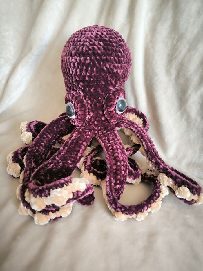 Poulpe au crochet réalisé à la main. Yeux sécurisés. Laine velours. Ne convient pas aux enfants de moins de 3 ans. Peut être utilisé en décoration sans problème. Il mesure environ 40cm de long