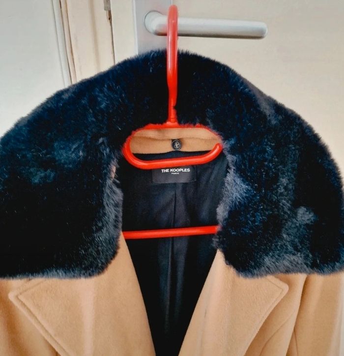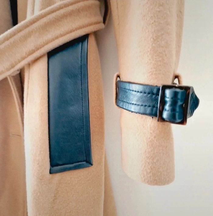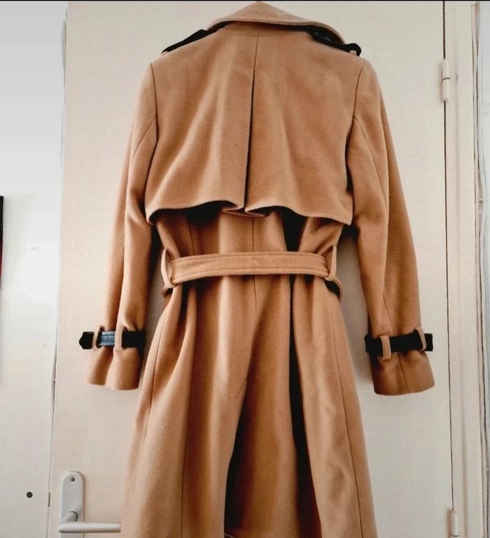 Manteau trench beige en laine Finition soignées col fourrure amovible doux, poches, épaulettes et manchettes en cuir. Tiens chaud parfait pour l hiver. Taille 34 36