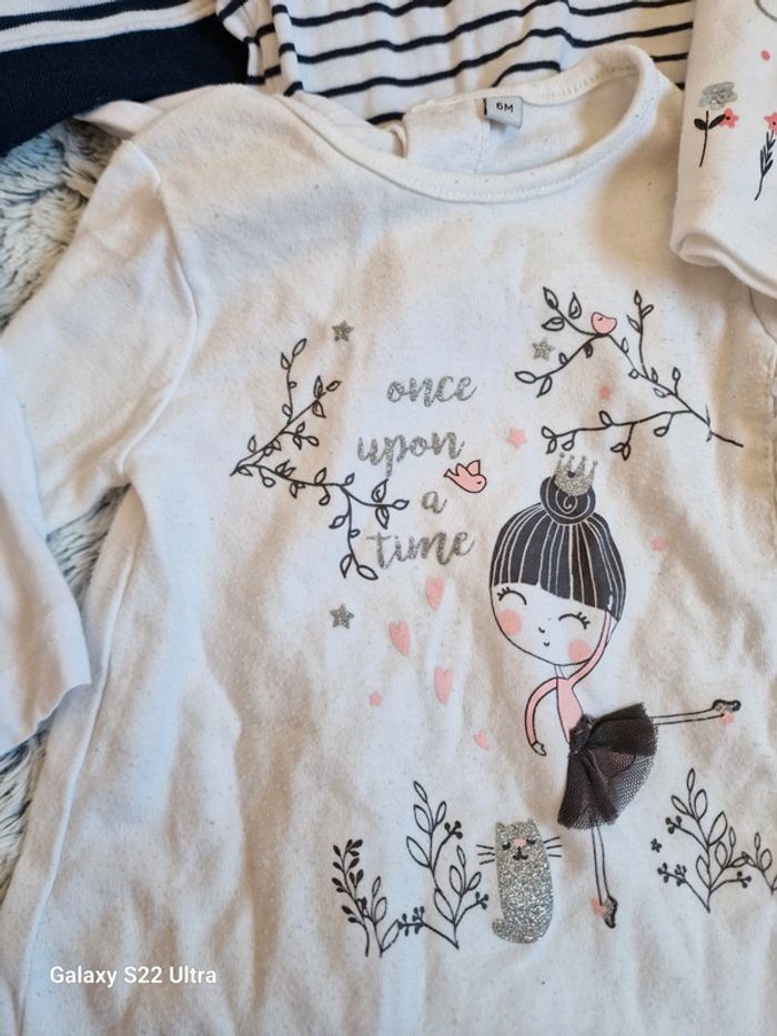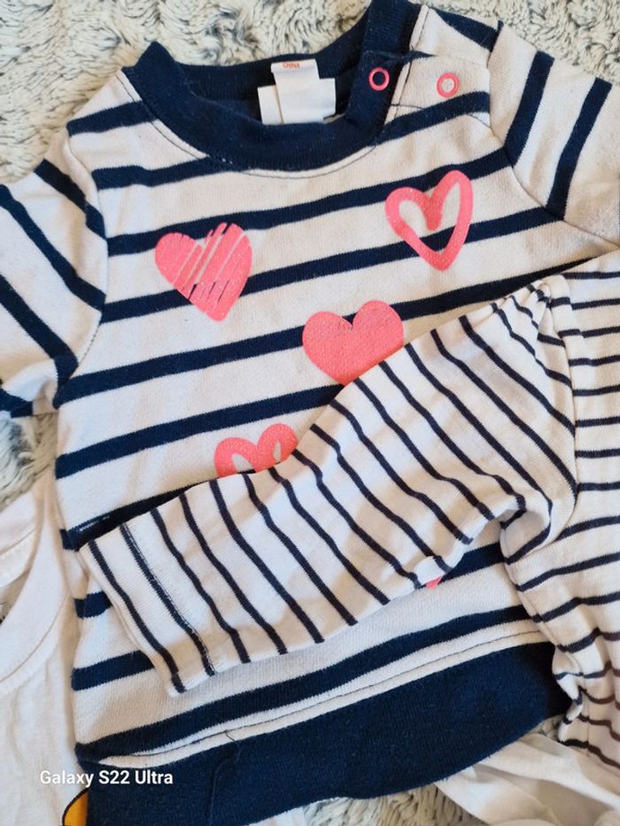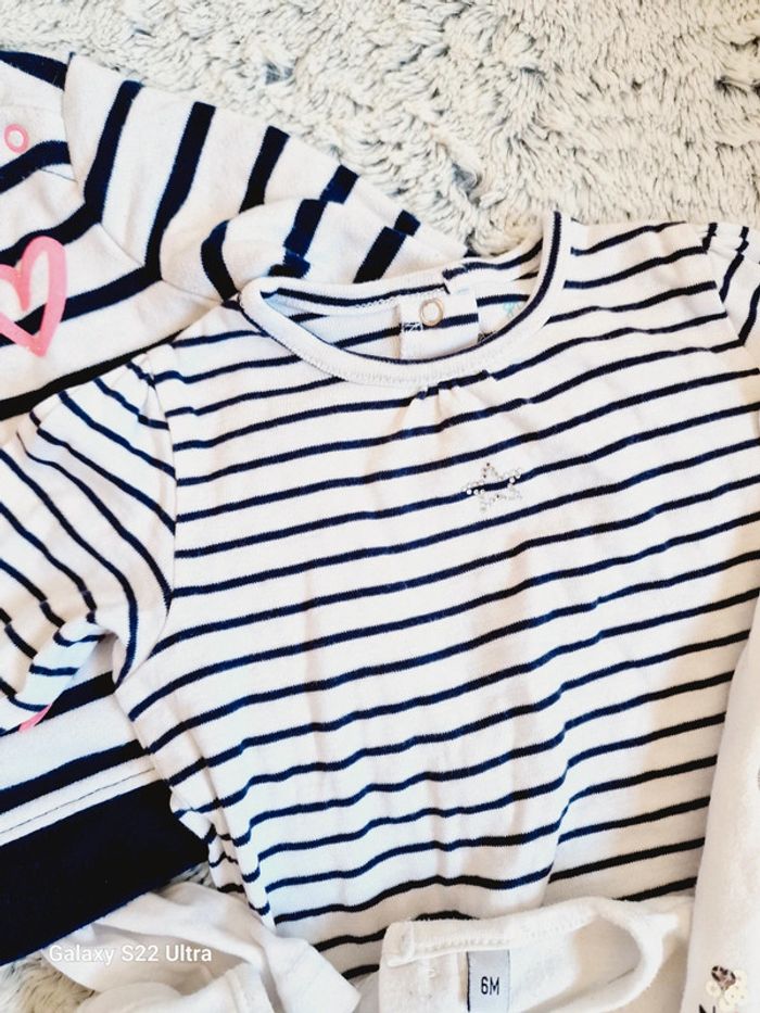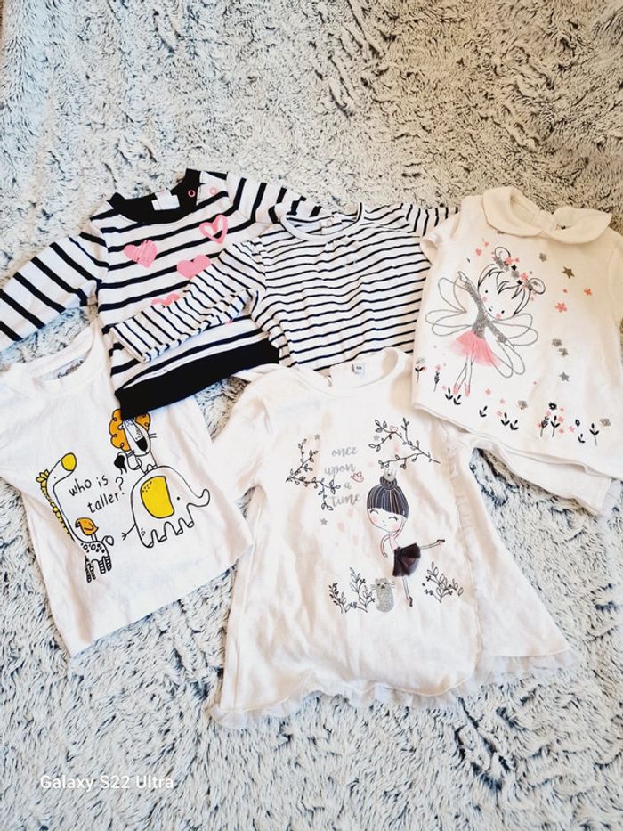 Lot de 5 Tee-shirt manche longue 1 mariniere avec des coeurs rose 1 marinière grain de Blé 1 blanc avec 1 fee rose 1 blanc avec des animaux 1 blanc avec danseuse en bon etat celui la les autres sont parfait