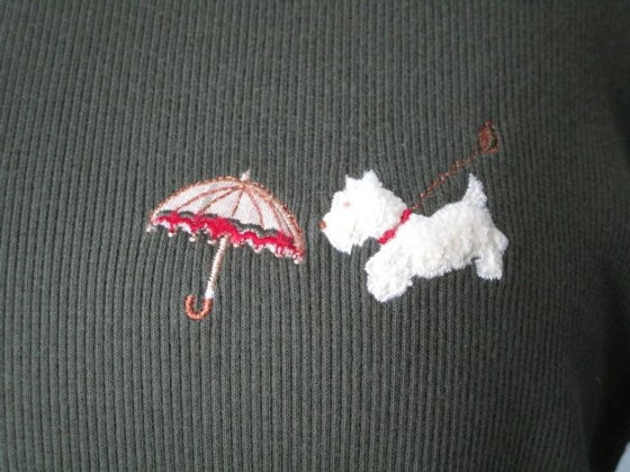 Sous-pull vert bouteille vintage Taille 2, correspond à du 40 (cf mesures) Broderie parapluie et petit chien côté gauche de la poitrine 100% cotn Largeur carrure : 41 cm Largeur aisselle à aisselle : 50 cm Longueur : 65 cm En très bon état #mamanbrade59femme40