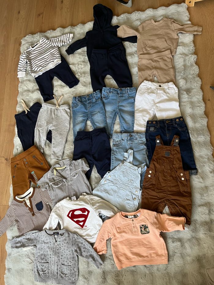 Lot vêtements 6 mois : 3 ensemble, 9 bas, 2 salopettes, 4 hauts et 1 veste.