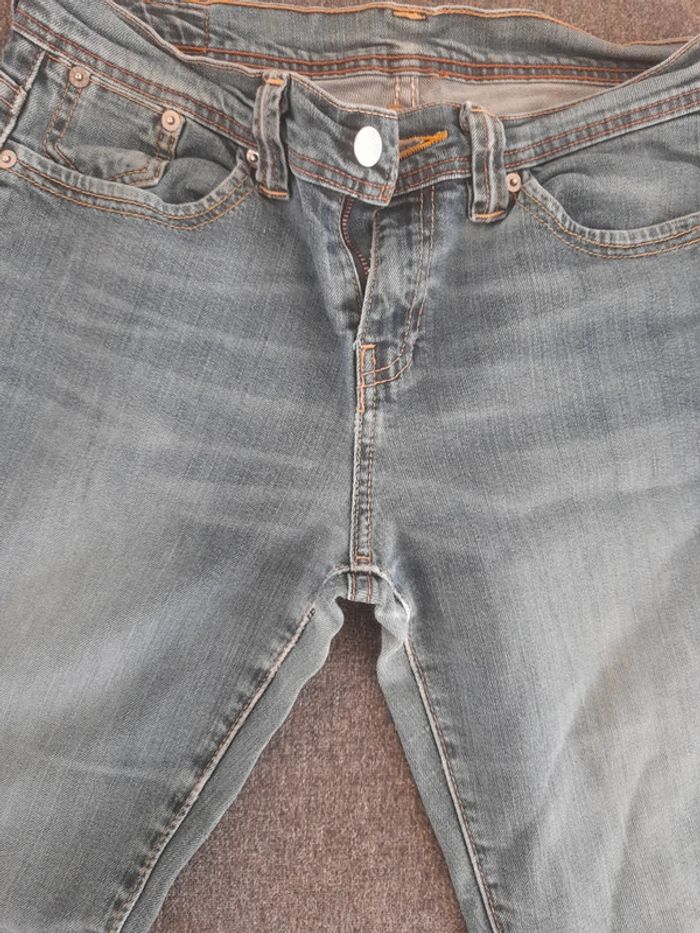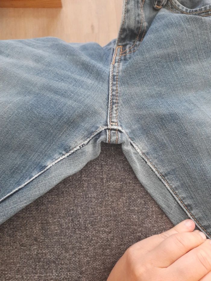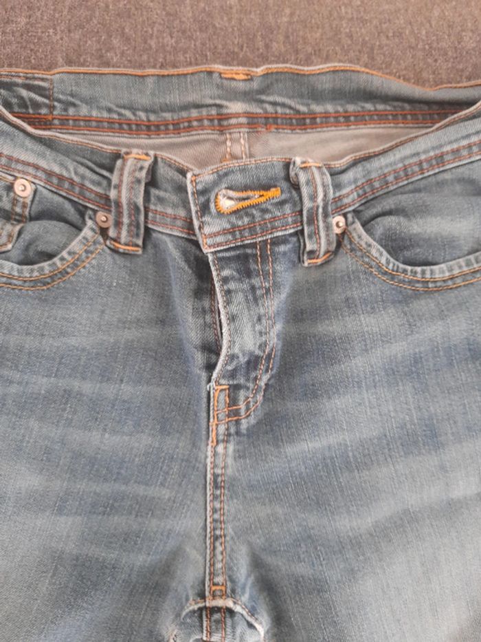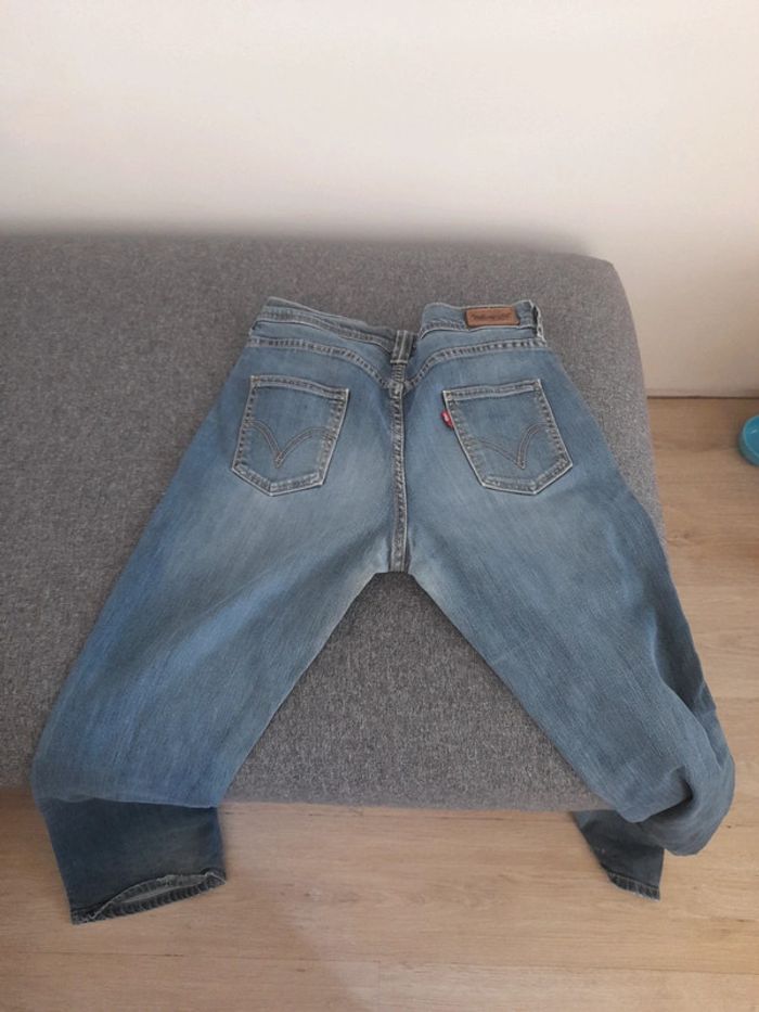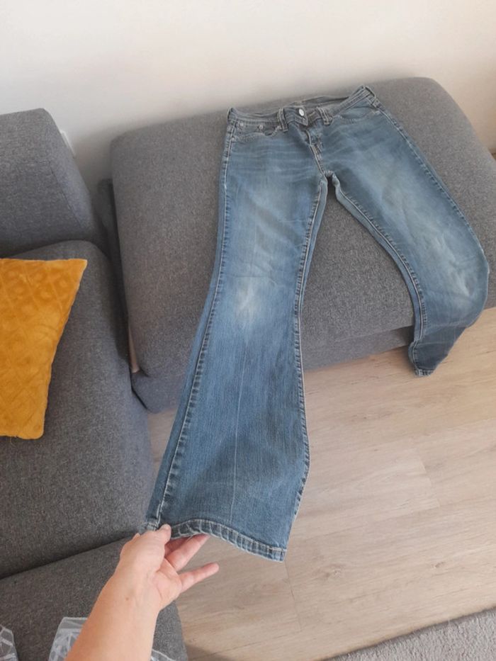 Porté je le vend car trop petit. Légère usure à l entrejambe, bas du pantalon abîmé. Le délavé est d origine. Serre à la taille et en haut du jean la coupe est évasée évasée bas du pantalon. #38vetementfemmecali91300