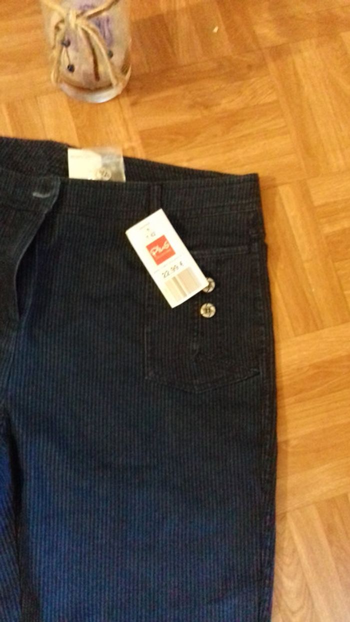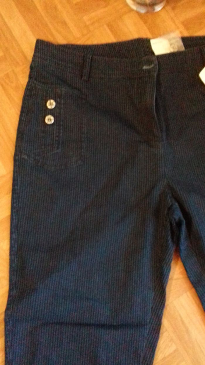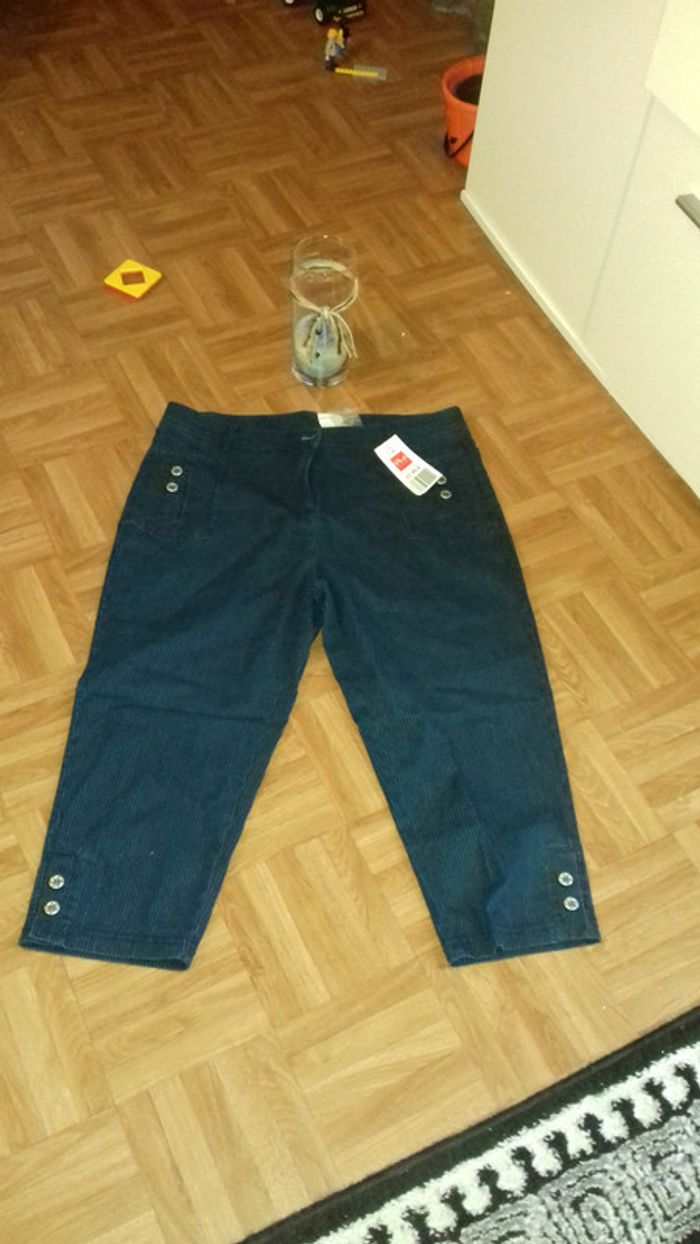 Neuf. Pantacourt tissu bleu rayures discrètes. 2 poches plaques devant avec boutons décoratifs. Photo avec et sans flash. #42vetementfemmecali91300