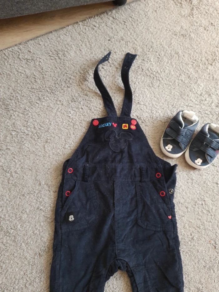 Tres bon état. Salopette en velours côtelé. 2 tailles de pressions pour les bretelles et pressions à l entrejambe. Tres bon état. Baskets taille 9/12 mois. 71 cm #9moisgarconcali91300