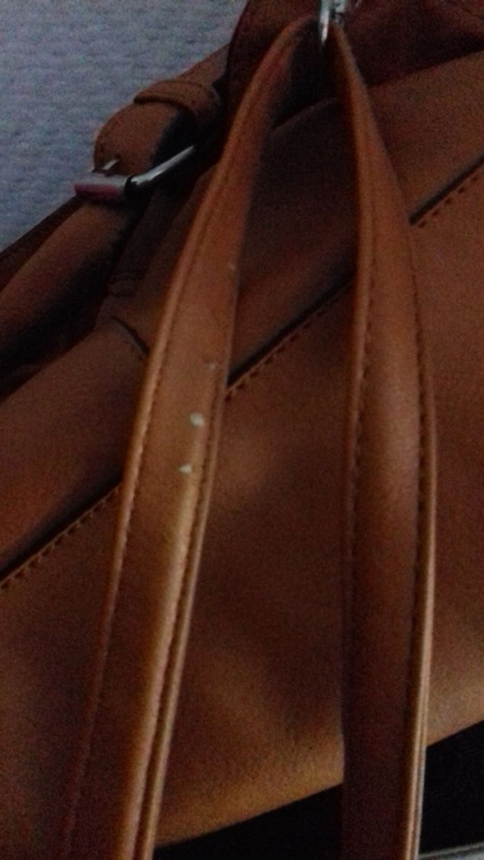 Utilisé. Sac poignées et bandoulières. 28 cm de hauteur 38 cm de largeur. Se ferme avec aimant. Pochette fixe à l intérieure du sac cf photo 5. Cette pochette se ferme par fermeture éclair. Permet d avoir 2 compartiments et ranger les petits objets . Defauts: poignées et badouliere usées cf photos. Le dos du sac à un peu deteind avec les frottements. Pas visible quand porté. #accessoiresfemmecali91300