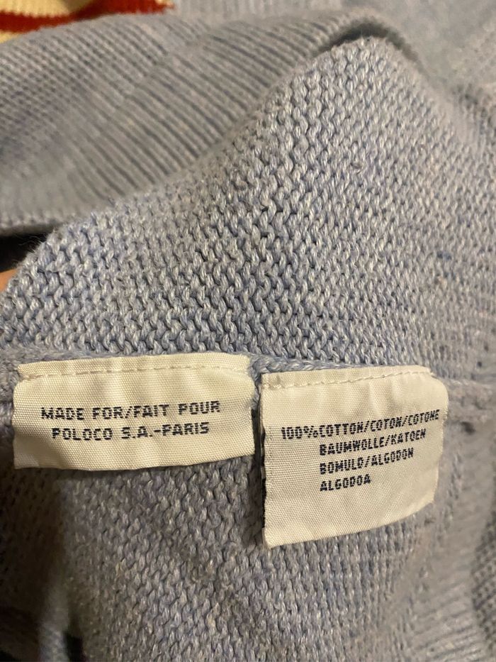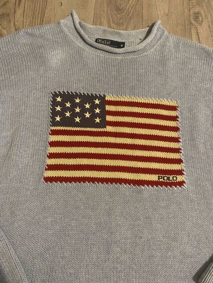Pull flag Ralph Lauren, bleu clair, vintage, acheté environ 400€ durant un voyage en Italie, il s'accorde avec tout type de tenue allant du class au décontracté, il tient bien chaud !! Ouverte à toutes propositions!