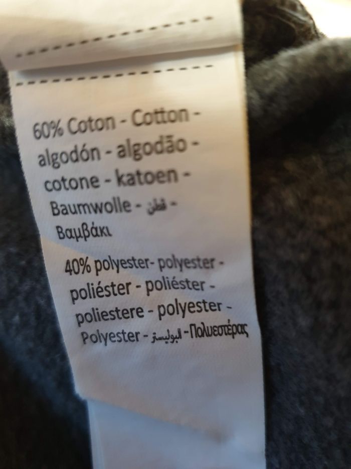 Jogging en molleton bicolore avec bandes contrastées; bas avec taille élastiquée et cordon de serrage; le haut est un gilet zippé à capuche Le bas peluche légèrement. Prix neuf: 33,99 euros