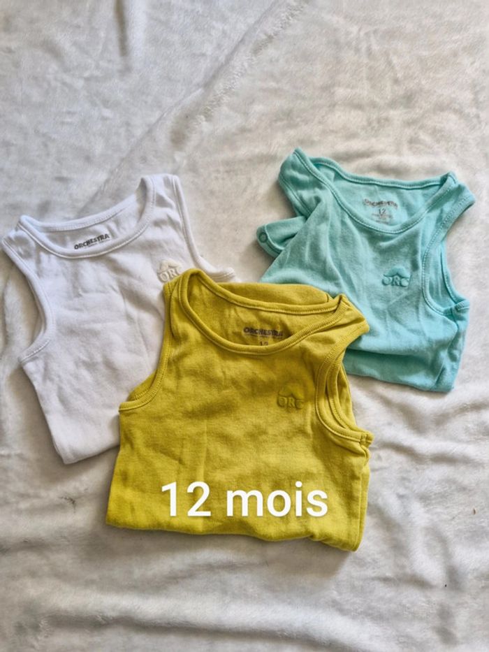 Lot de 4 bodys débardeurs (un body blanc n'est pas sur la photo) Orchestra Peu portés 12 mois 12 euros sur le site #ameliejuju30_12mois