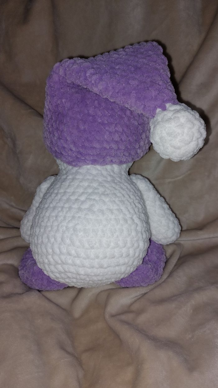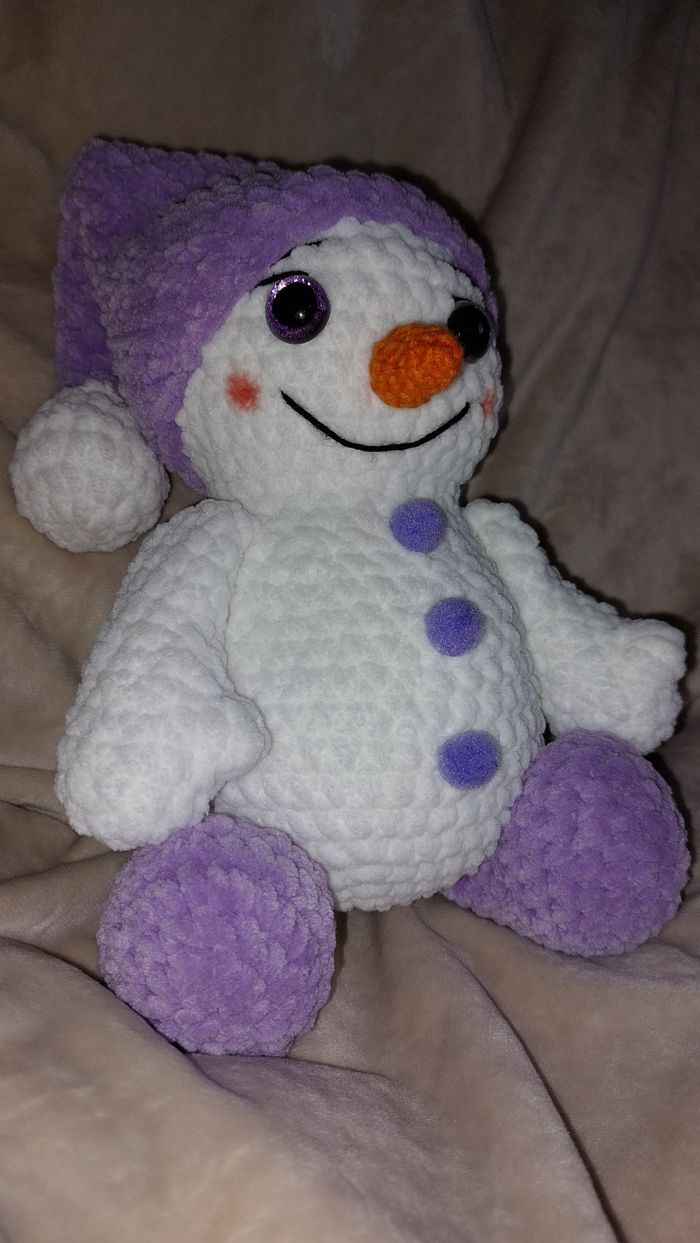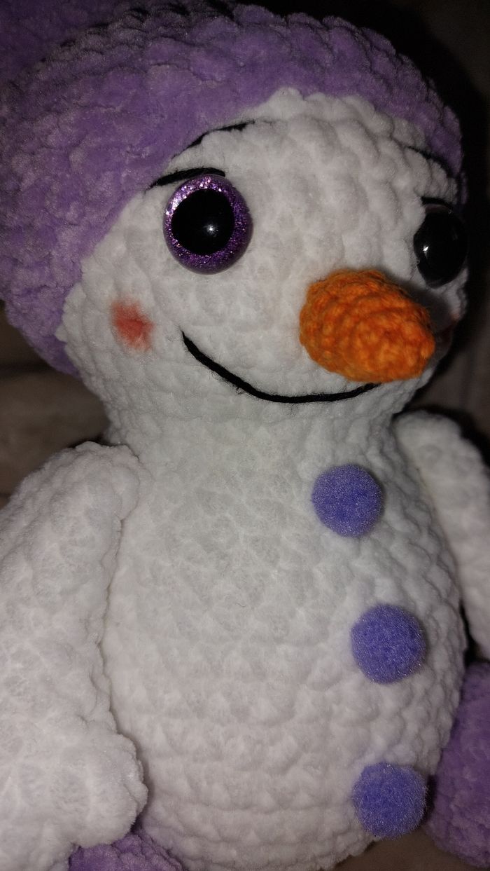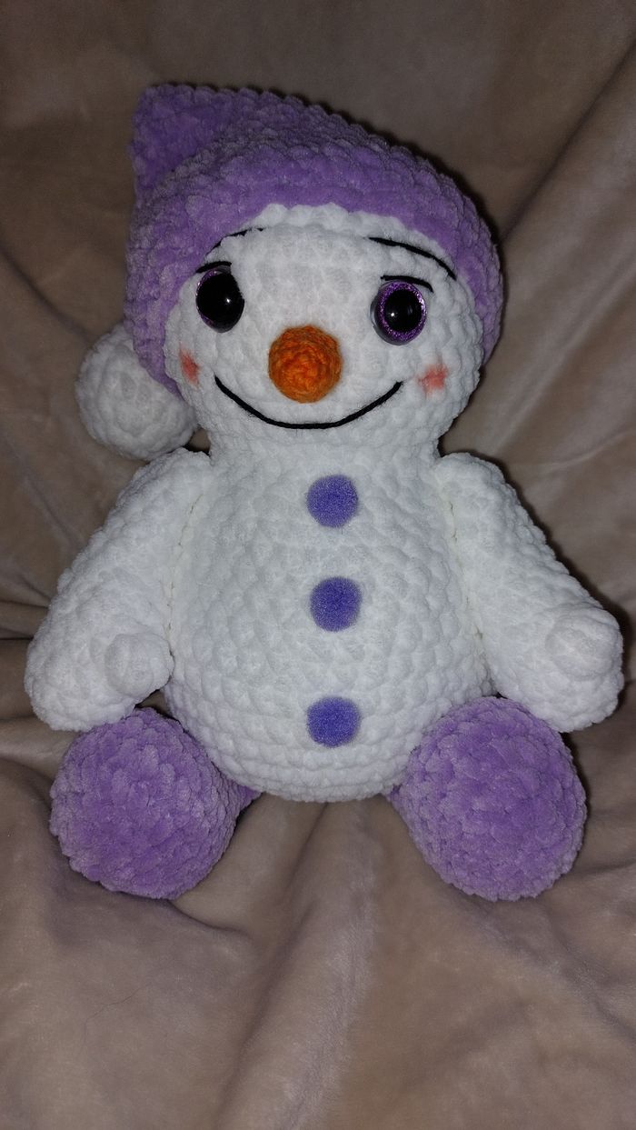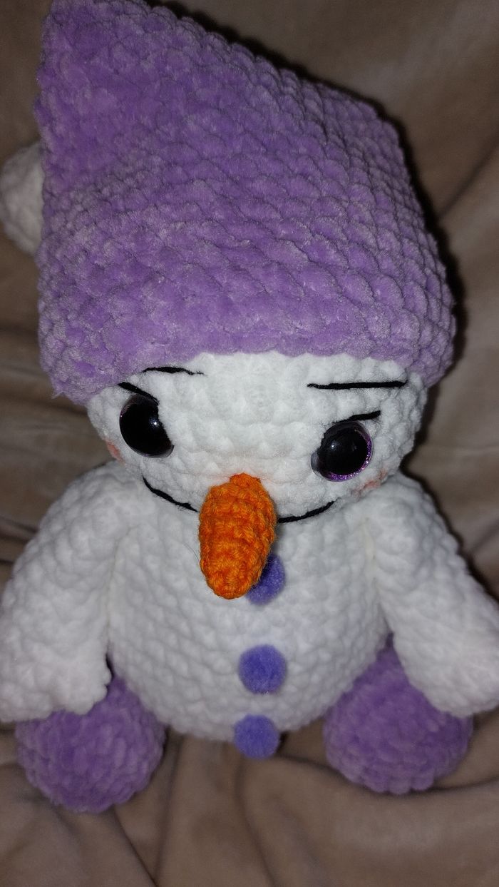 Bonhomme de neige violet au crochet réalisé à la main. Yeux sécurisés. Laine velours. Ne convient pas aux enfants de moins de 3 ans. Peut être utilisé en décoration sans problème. Il mesure environ 36cm de long