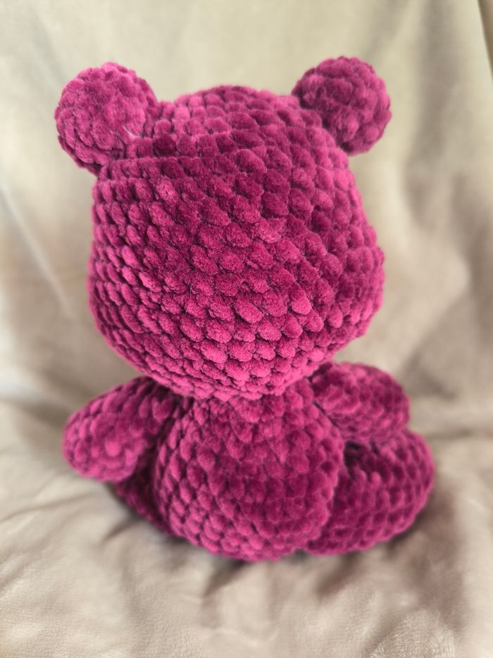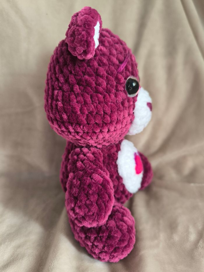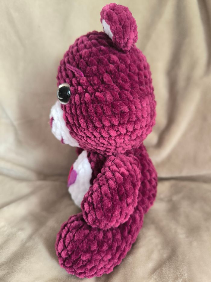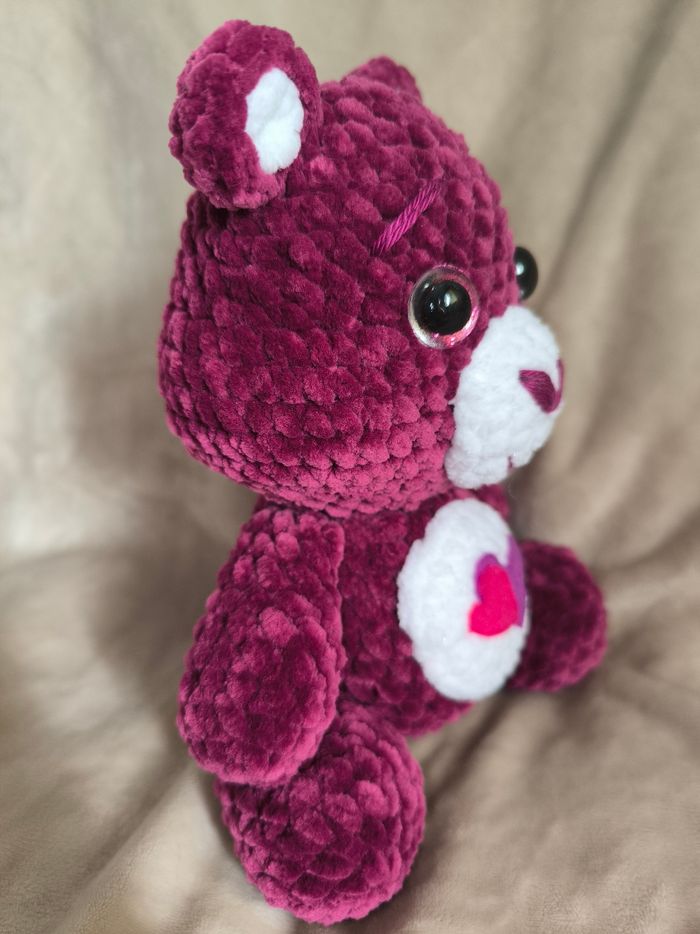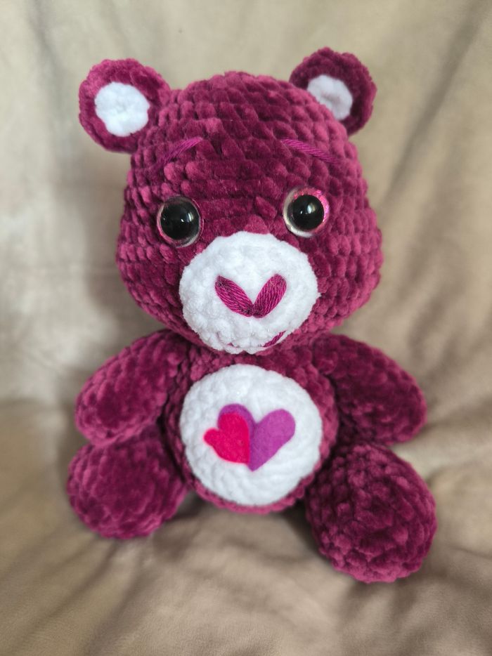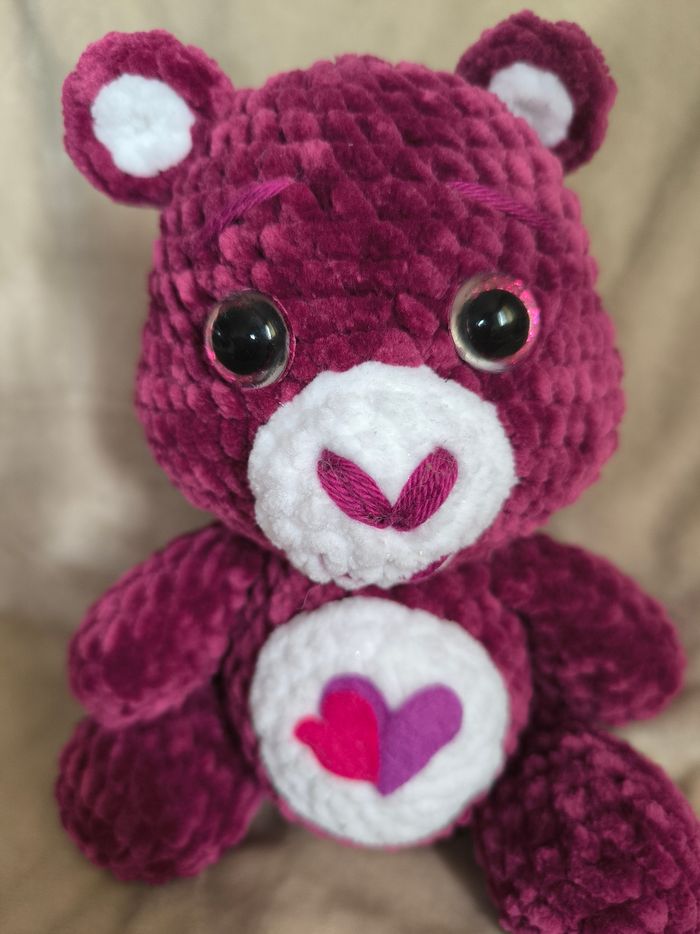 Bisounours prune double cœur 🩷💜 au crochet réalisé à la main. Yeux sécurisés. Laine velours. Ne convient pas aux enfants de moins de 3 ans. Peut être utilisé en décoration sans problème. Il mesure environ 18cm de long