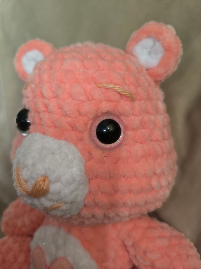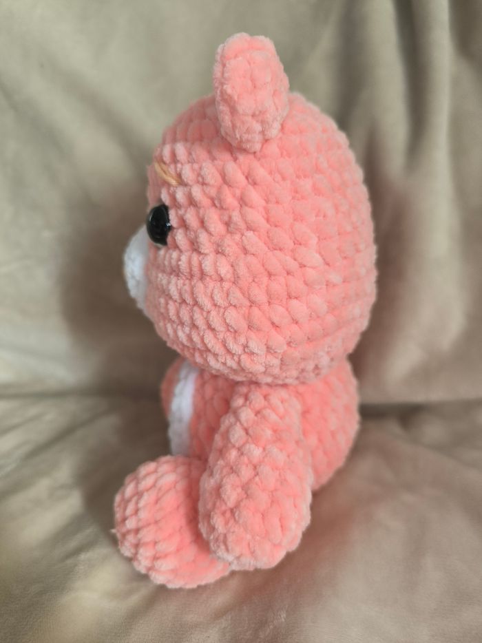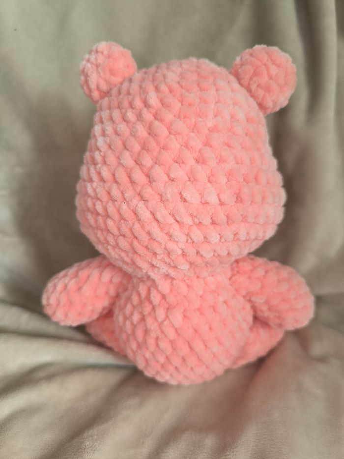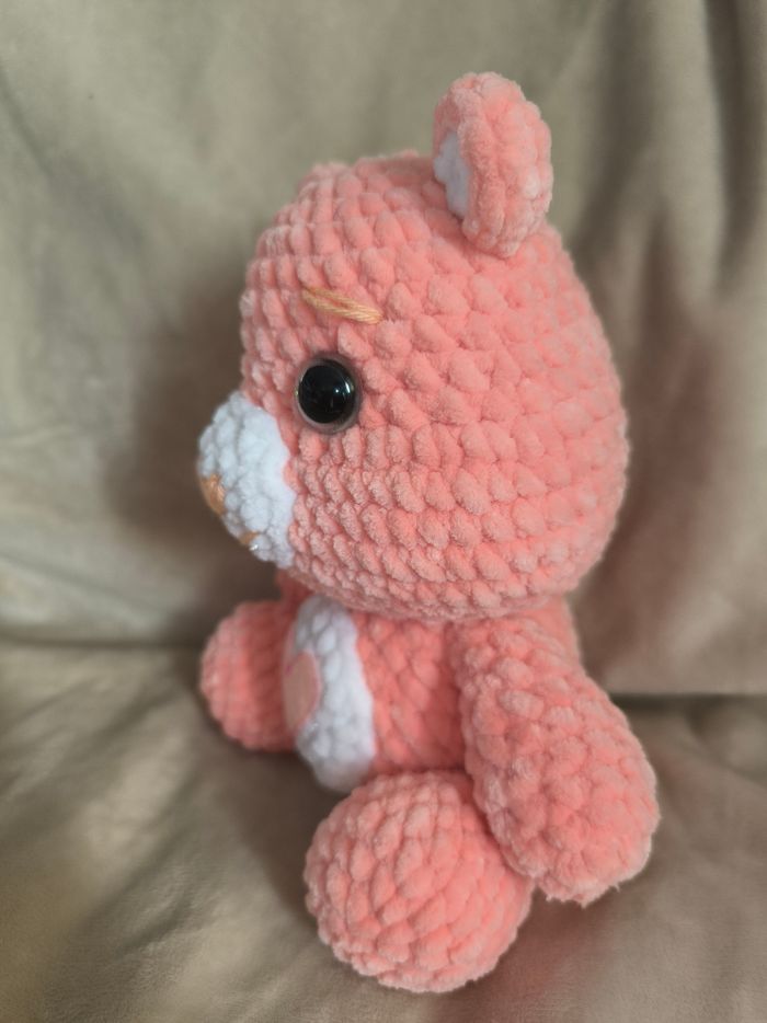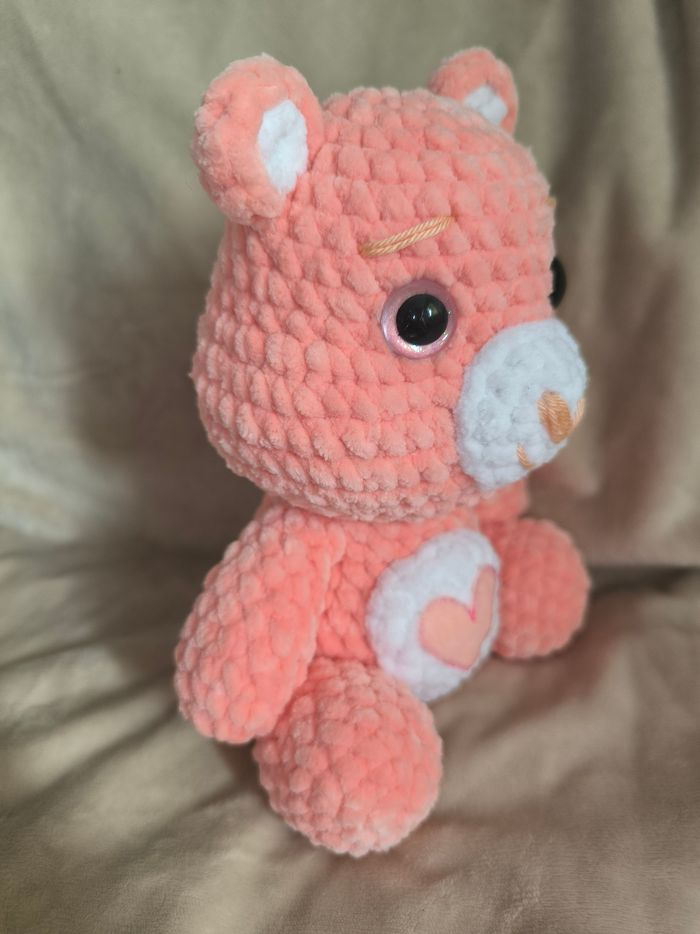 Bisounours pêche cœur 🩷 au crochet réalisé à la main. Yeux sécurisés. Laine velours. Ne convient pas aux enfants de moins de 3 ans. Peut être utilisé en décoration sans problème. Il mesure environ 18cm de long