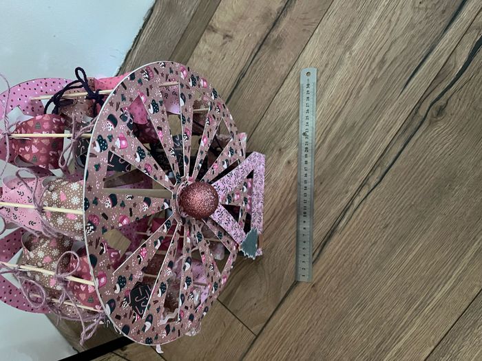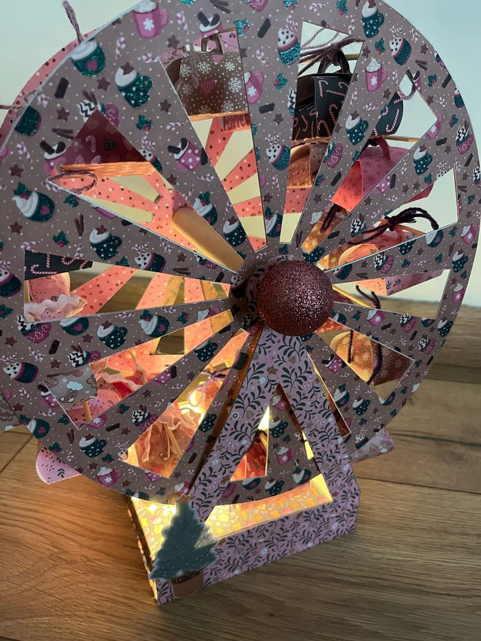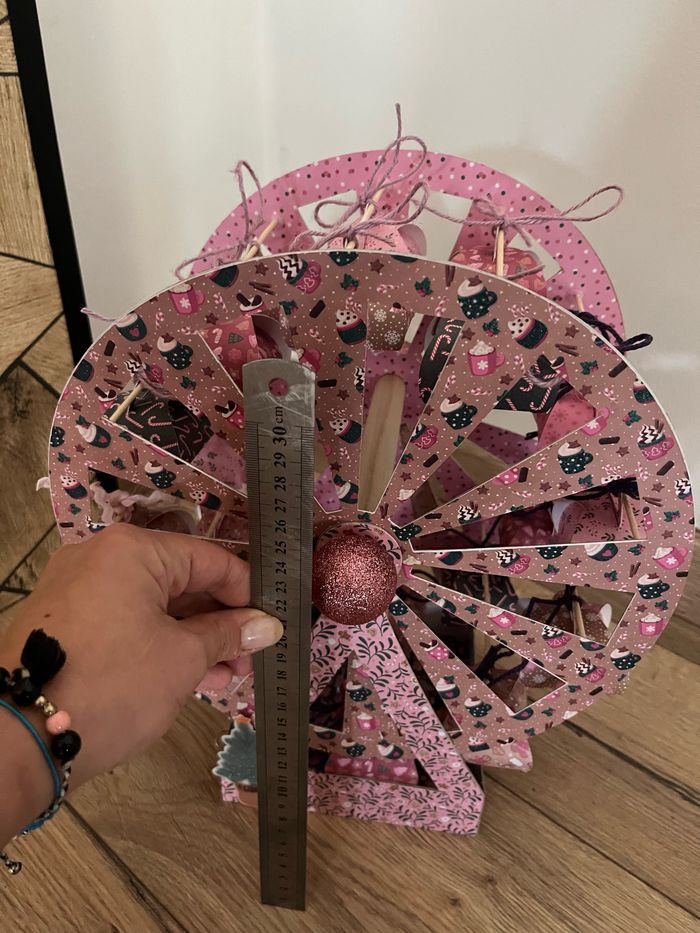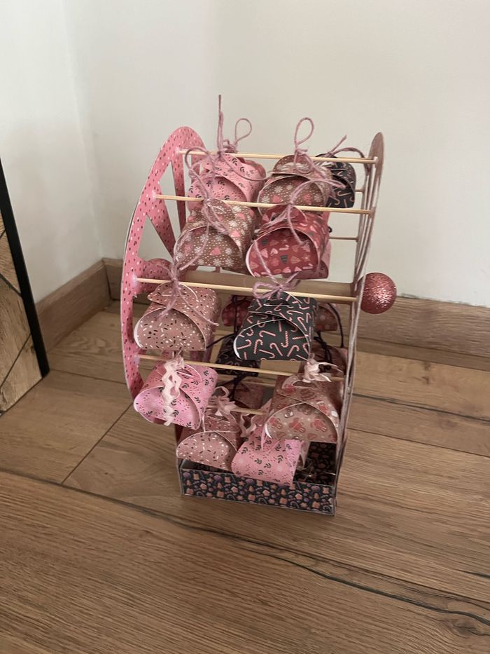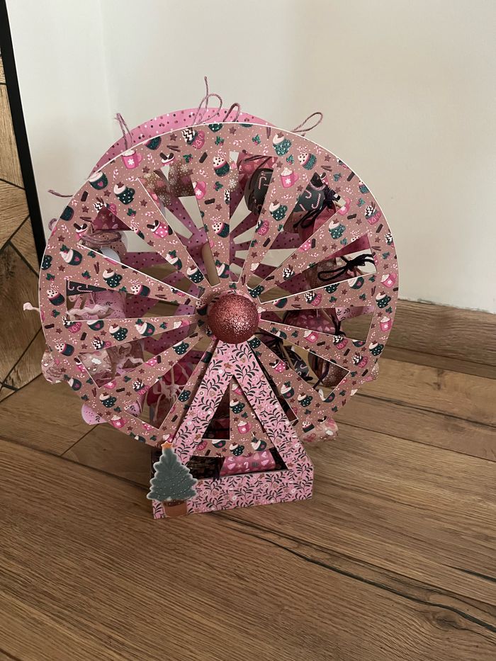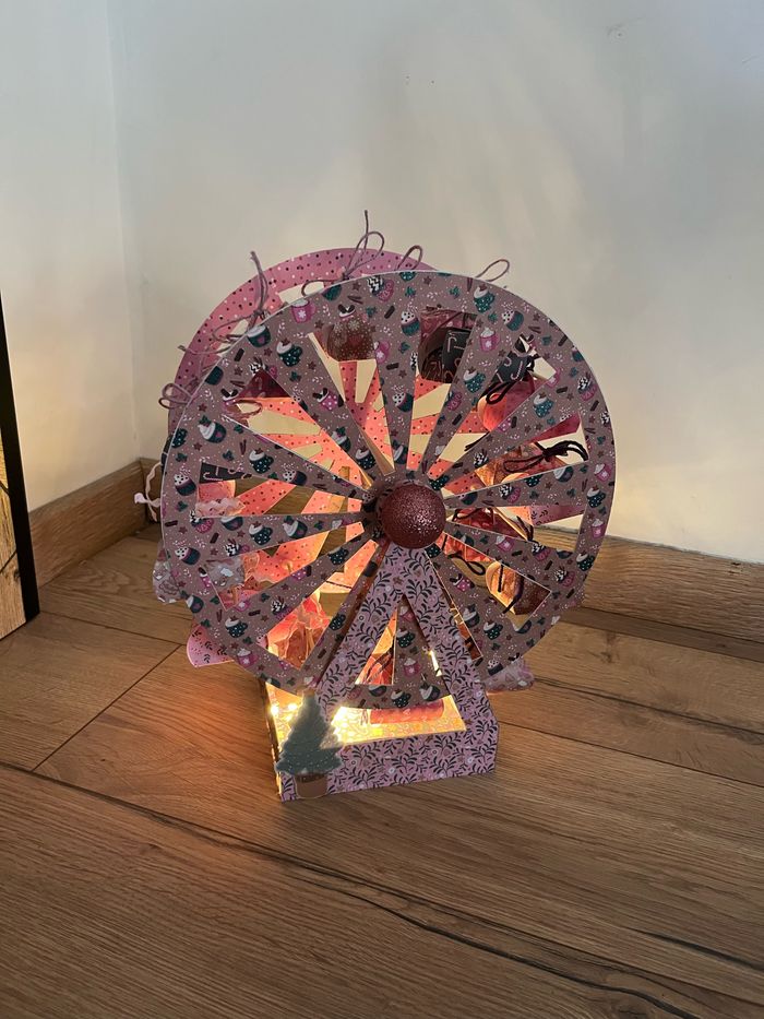 🎡 calendrier de l’avent « grande roue » 24 ballotins à remplir par vous 🎨 coloris rose 📓 papier cartonnée 💡 avec guirlande led Possible de passer par kiabi ou vin-ted
