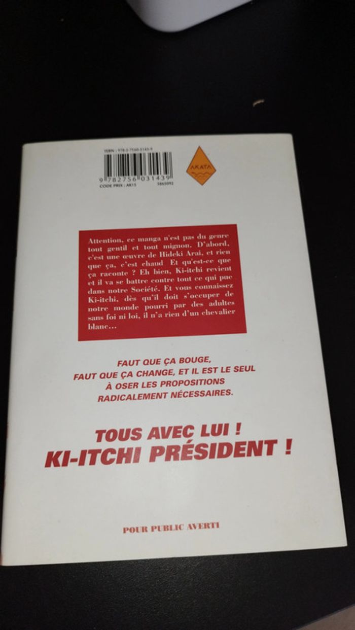 Manga Tome 1 - Ki Itchi Vs - Hideki Arai Pour public averti / Seinen Résumé ::: Toujours plus intransigeant face à l’injustice, Ki-itchi est devenu une star. Connu dans le monde entier pour avoir fait trembler l’establishment japonais, il ne compte pas s’en arrêter là. À présent à la tête d’une grosse entreprise, entre école de pensée et mafia, dont les membres se comptent par milliers, il veut une nouvelle fois faire bouger la population, quitte à provoquer les puissants du pays !