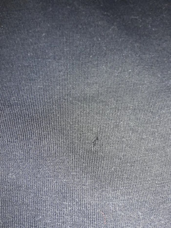 Porté mes reste en état satisfaisant. Un tout petit minuscule trou on bas derrière mes presque inaperçu on le voit pas . État satisfaisant.