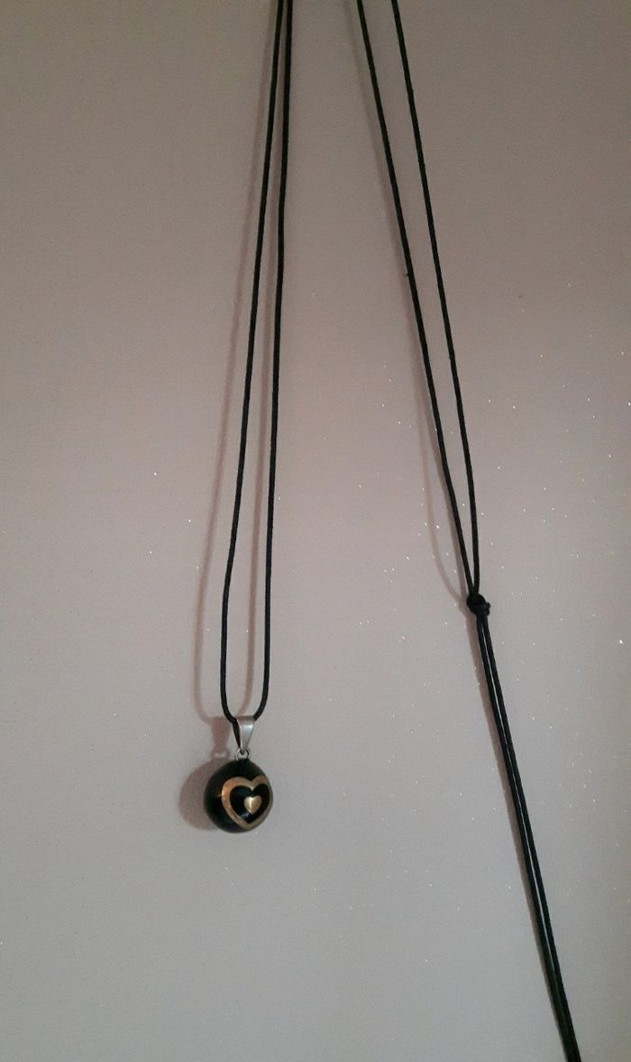 Joli pendentif bola de grossesse en excellent état Cordon et bola noir décor doré