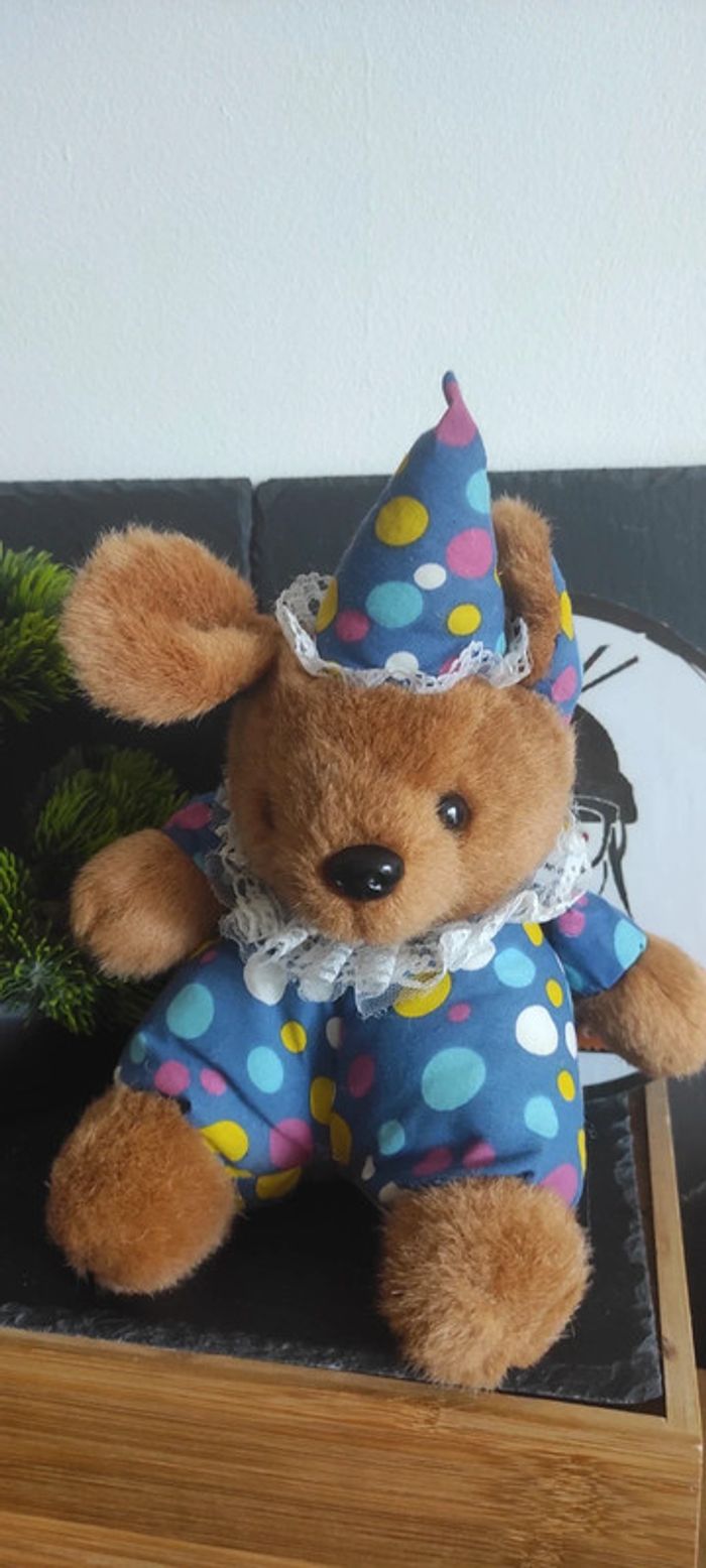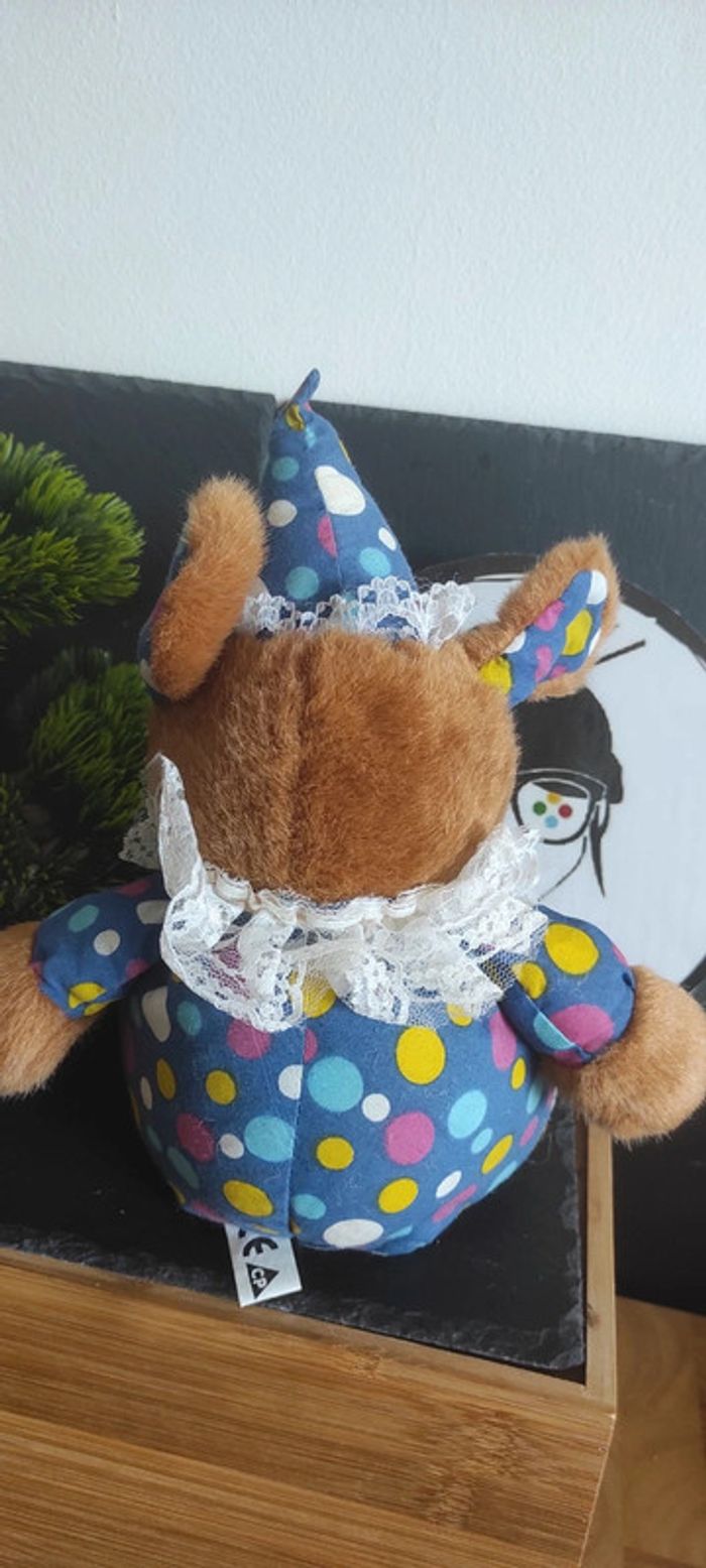 doudou peluche ours clown cp lapin bonnet bleu pois jaune rose marron dentelle - photo numéro 1