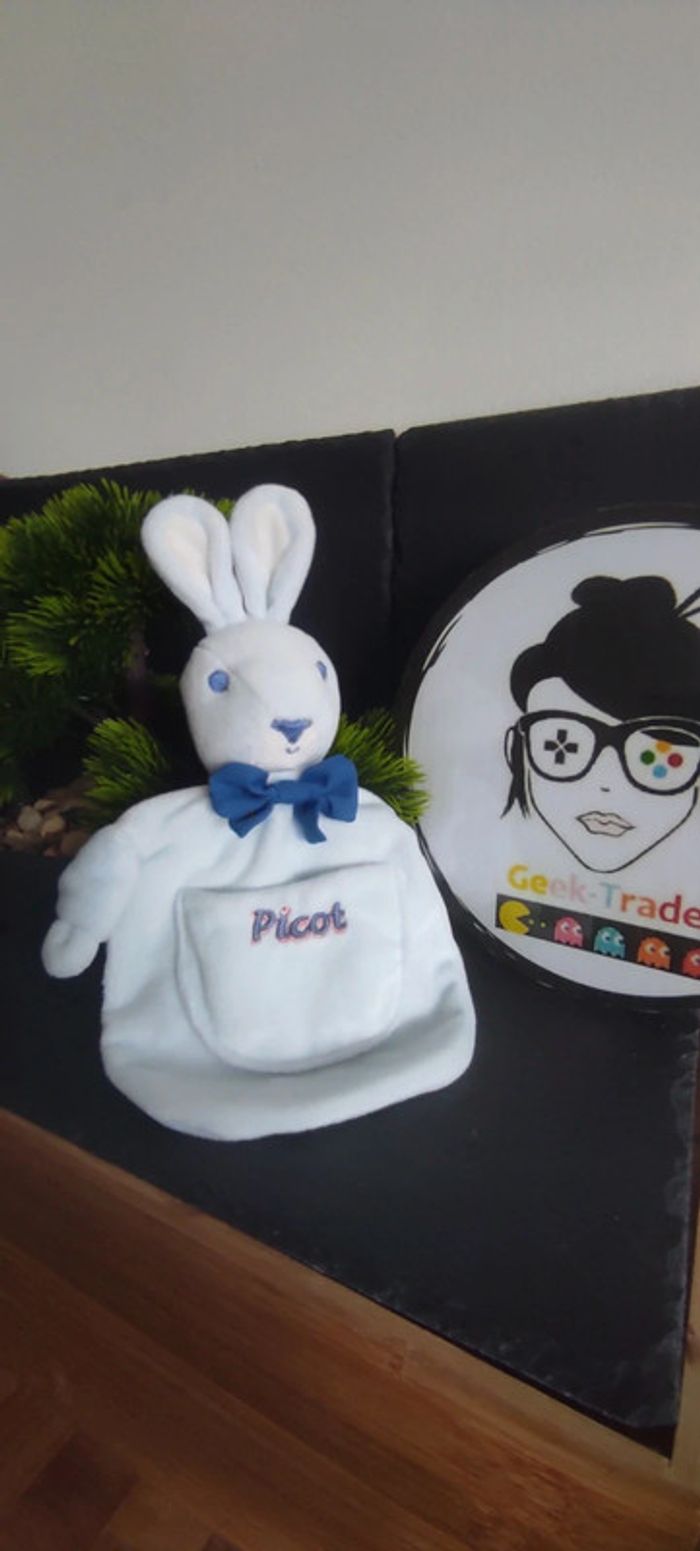 Doudou Plat Lapin bleu Laboratoires Picot nœud blanc rose DD001184 Bon etat Afin de ne pas abîmer les doudous et de laisser le choix dans l'utilisation de la lessive les peluches ne sont pas lavées avant envoi Description complément : #geektradepicot Petit nettoyage à prévoir Vous achetez ce que vous voyez les photos font entièrement partie de la description Transport : Les frais de transport comprennent les frais du transporteur ainsi que l'emballage pour protéger au mieux votre achat. Chaque achat est envoyé en format colis avec numéro de suivi Le poids du colis est de 500g finit (je ne peux pas faire moins) il peut donc y avoir plusieurs objets dans le carton si vous le souhaitez (contactez moi afinde grouper les frais de port) Référencement : #geektradedoudou #peluche #plush  #doudou #enfant #bebe