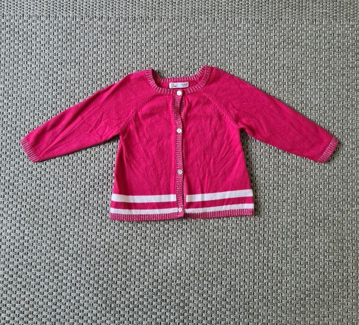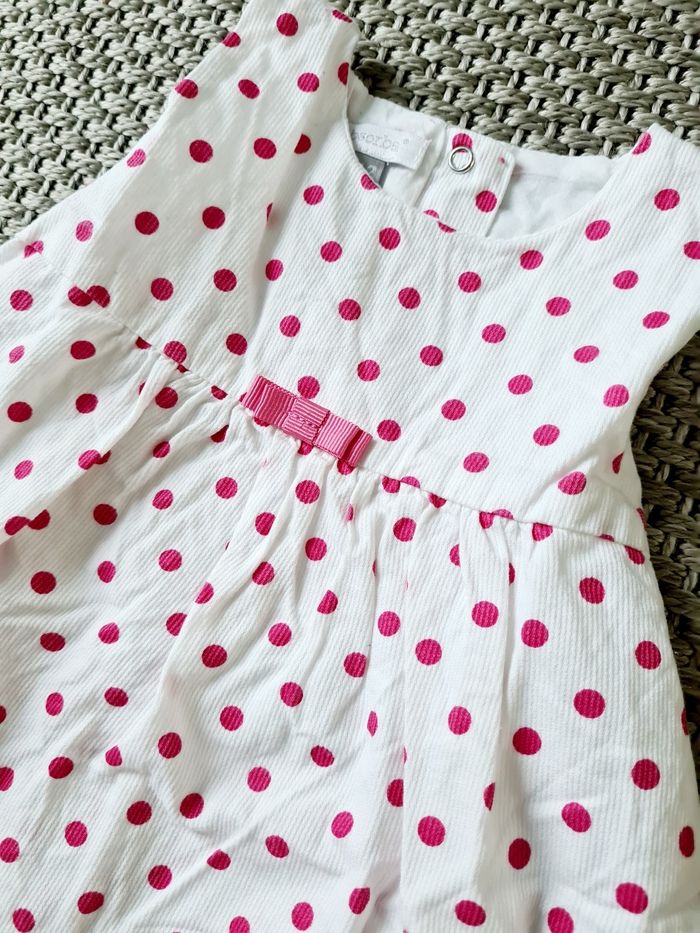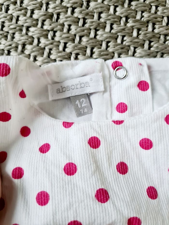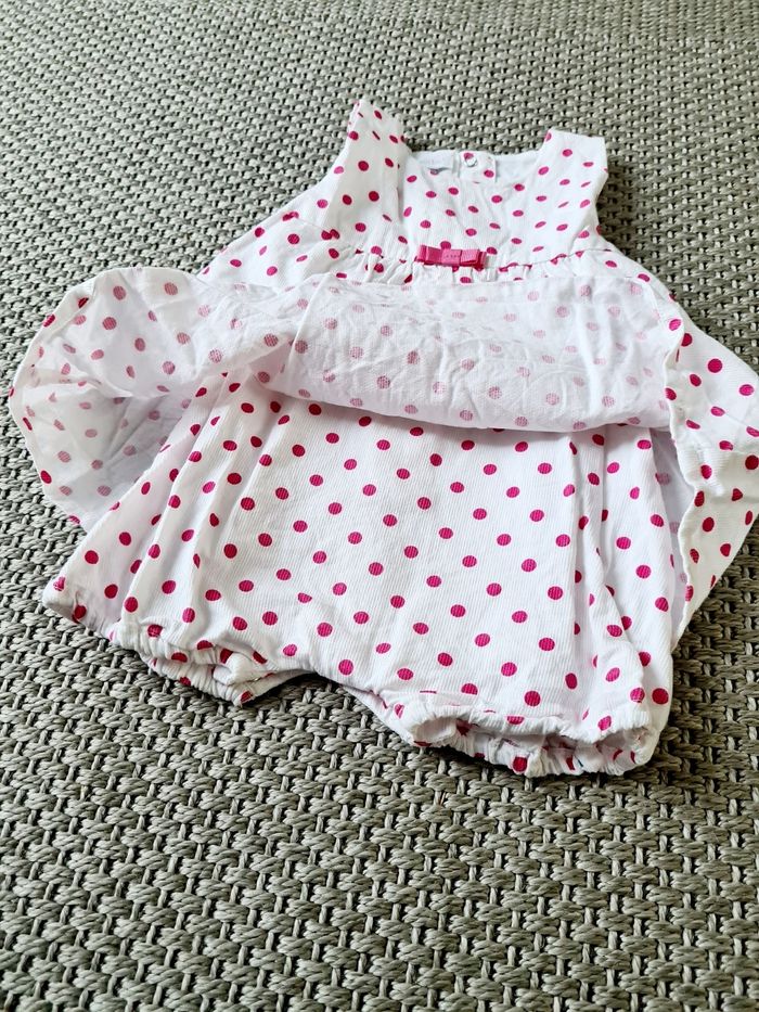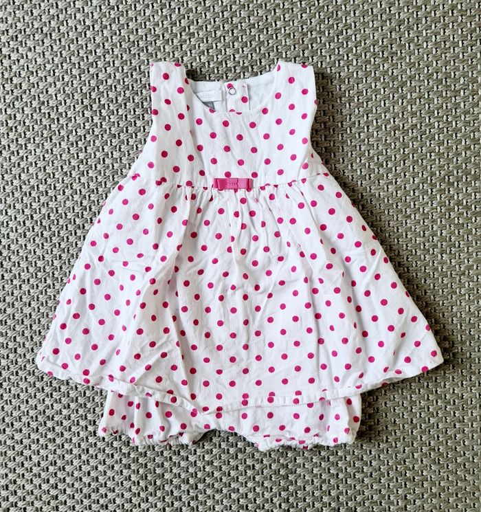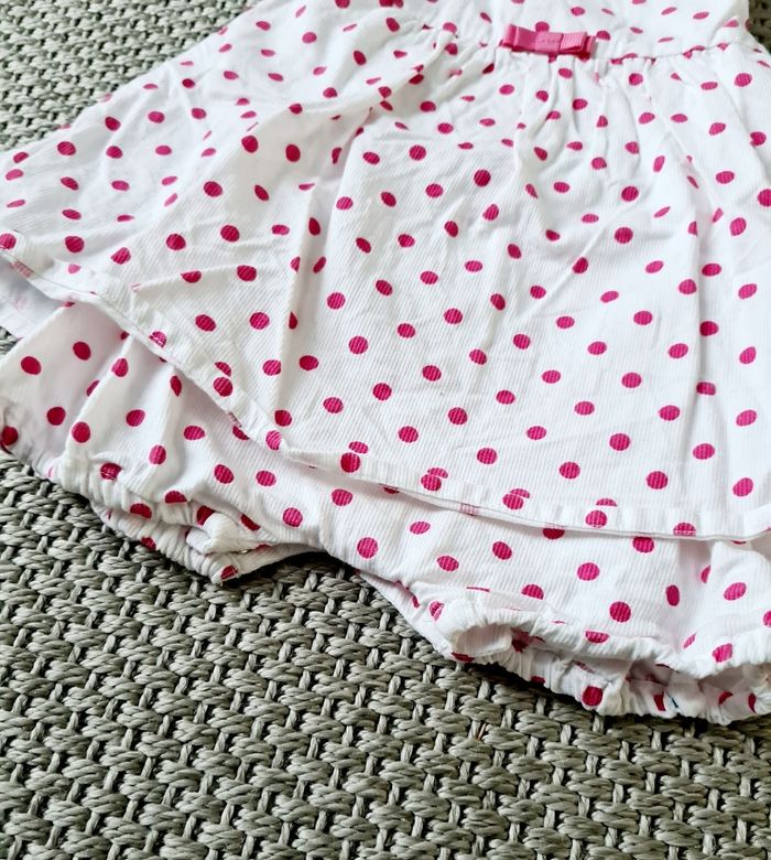 Ensemble robe culotte à pois rose et gilet rose assortie en très bon état. Porté 2 fois car acheté trop petit. Robe : couleur blanche à pois rose fuchsia. boutons à pressions dans le dos et entre jambe pour le change. 12 mois - 74 cm - Marque ABSORBA Gilet : couleur rose fuchsia avec motif dans le dos. Boutons à enfiler sur le devant. 12 mois - 74 cm - marque DPAM Envoi Rapide et Soigné. J'applique des réductions sur lots