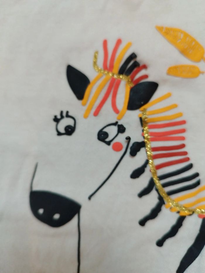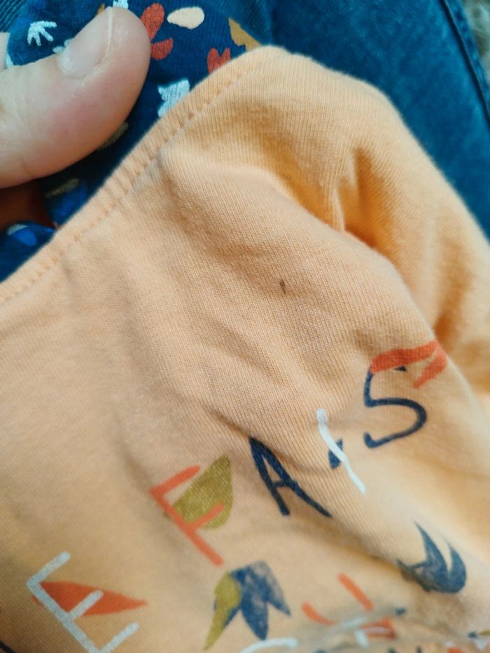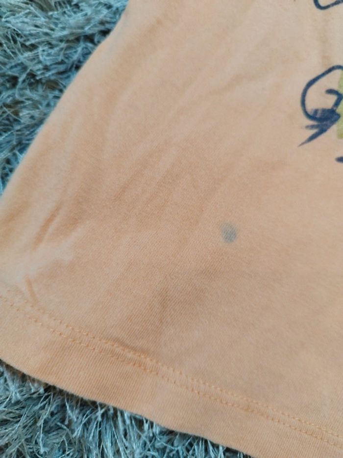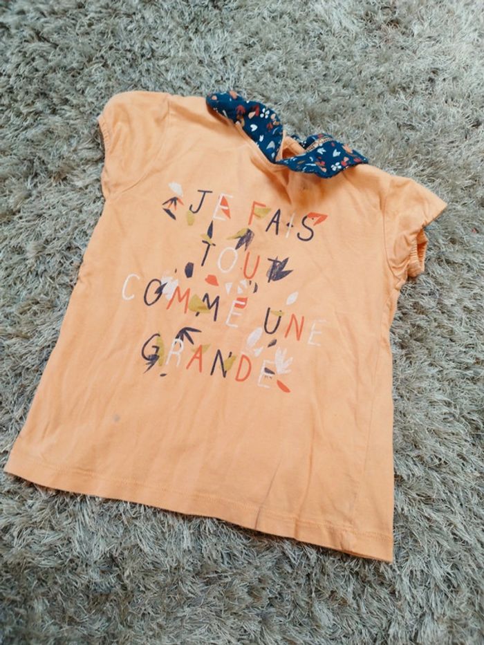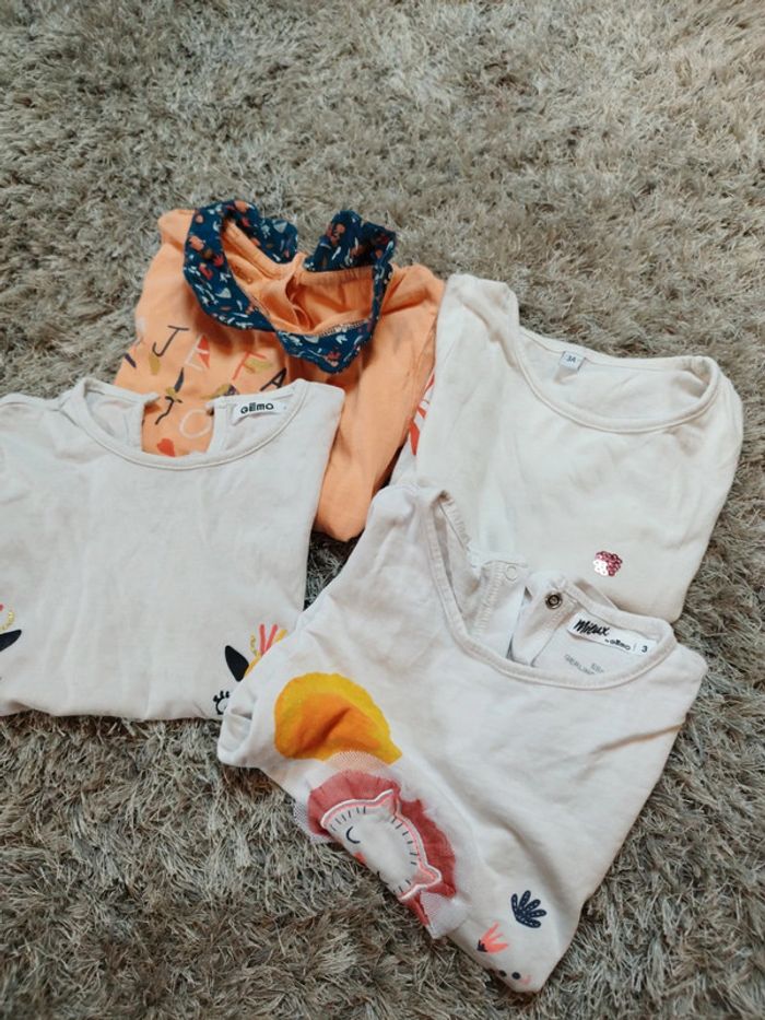 Lot de 4 t-shirt manches courtes filles un orange je fais tout comme une grande avec col claudine marque Gémo un blanc à motif fleuri un blanc Gémeaux motif zèbre et un blanc motif lion et soleil Gémo taille 3 ans Très bon état seul le orange a des défauts voir photos