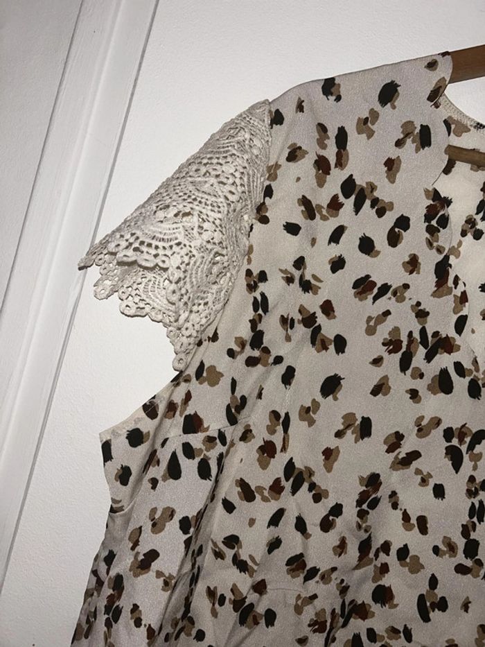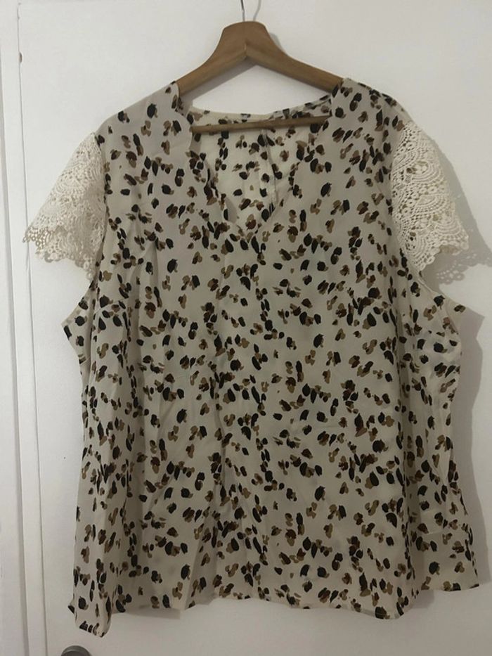 À vendre jolie blouse imprimé avec dentelle au niveau des manches et découpe au niveau du décolleté 4XL équivalent à une taille 52