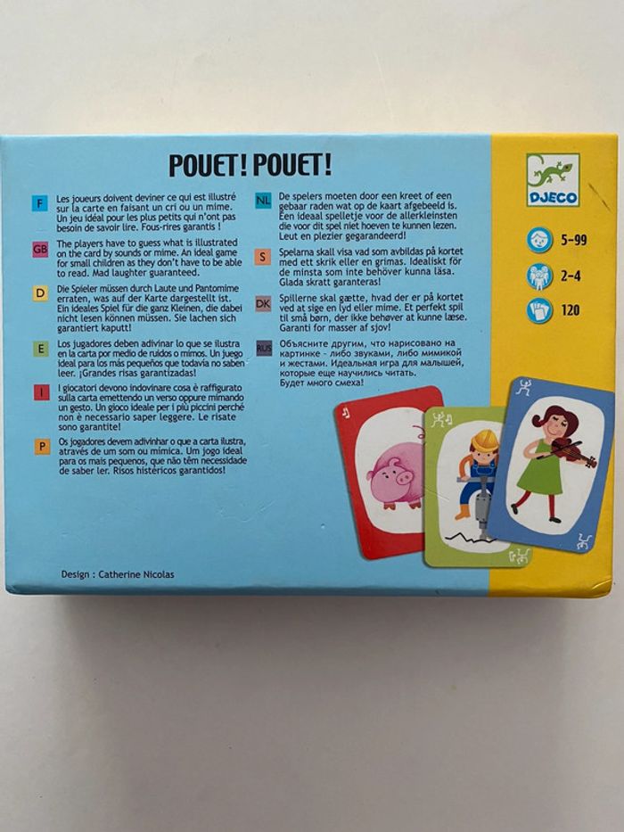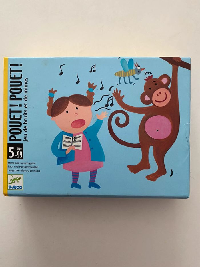 Très bon état DESCRIPTION Pouet ! Pouet ! est un jeu de bruits et de mimes où les joueurs doivent deviner ce qui est illustré sur la carte en faisant un cri ou un mime. Un jeu idéal pour les plus petits qui n'ont pas besoin de lire. Fous-rires garantis ! #orelia_lojesa_jeuxenfants