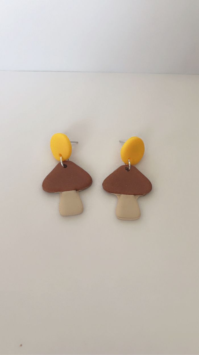✨ boucles d’oreilles 🍄‍🟫 forme champignon 🎨 beige, jaune, marron 🏷️ réalisé en pâte polymère / fimo. Acier inoxydable et fermoir au choix ( acier ou caoutchouc )