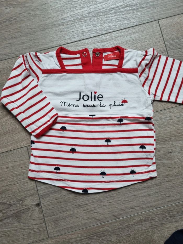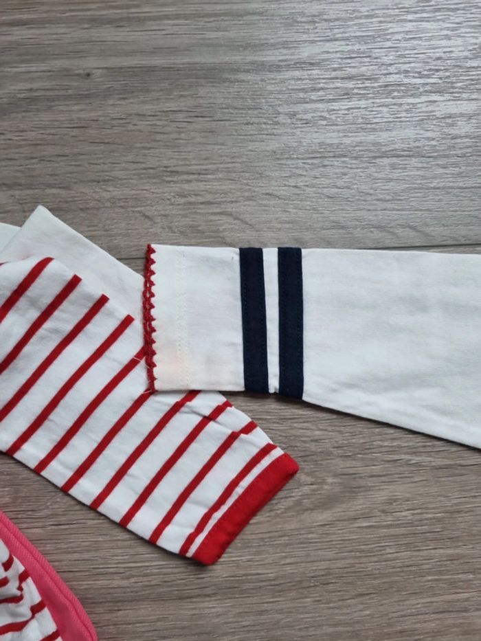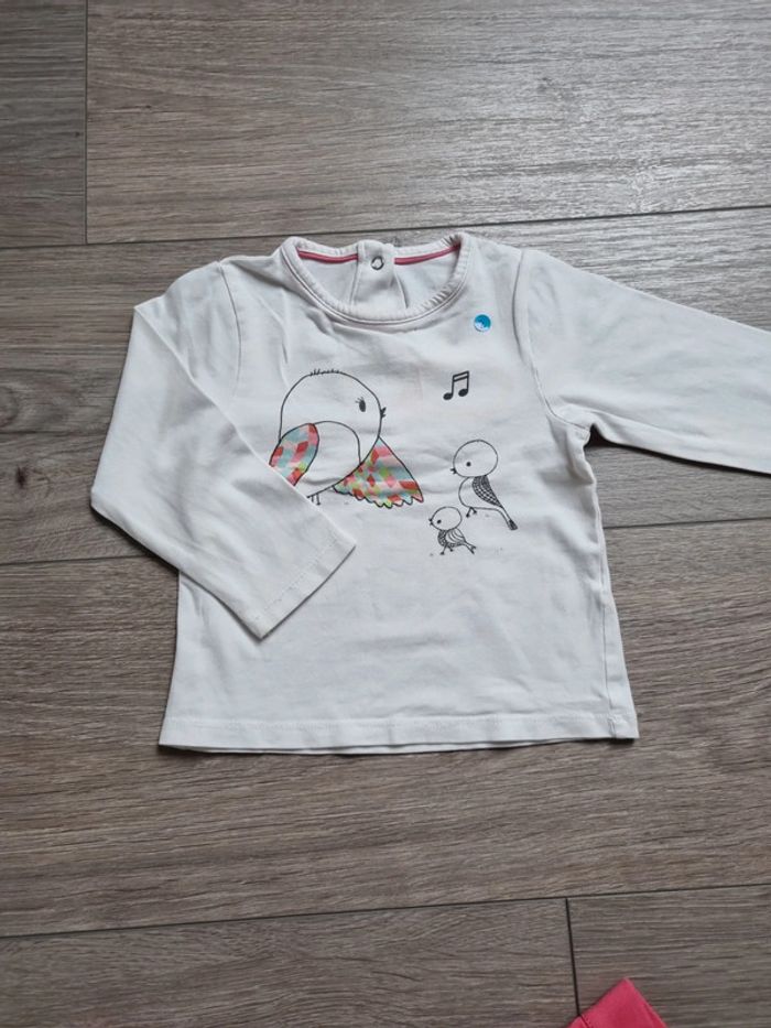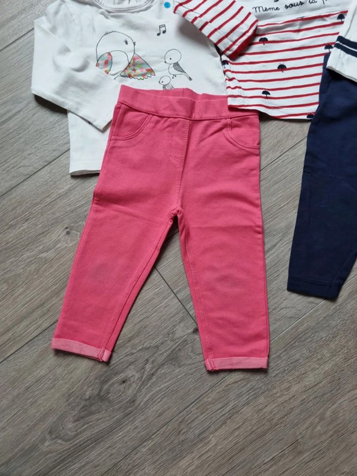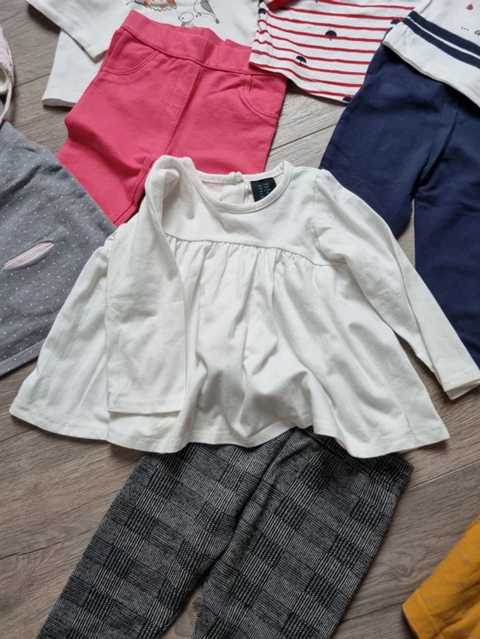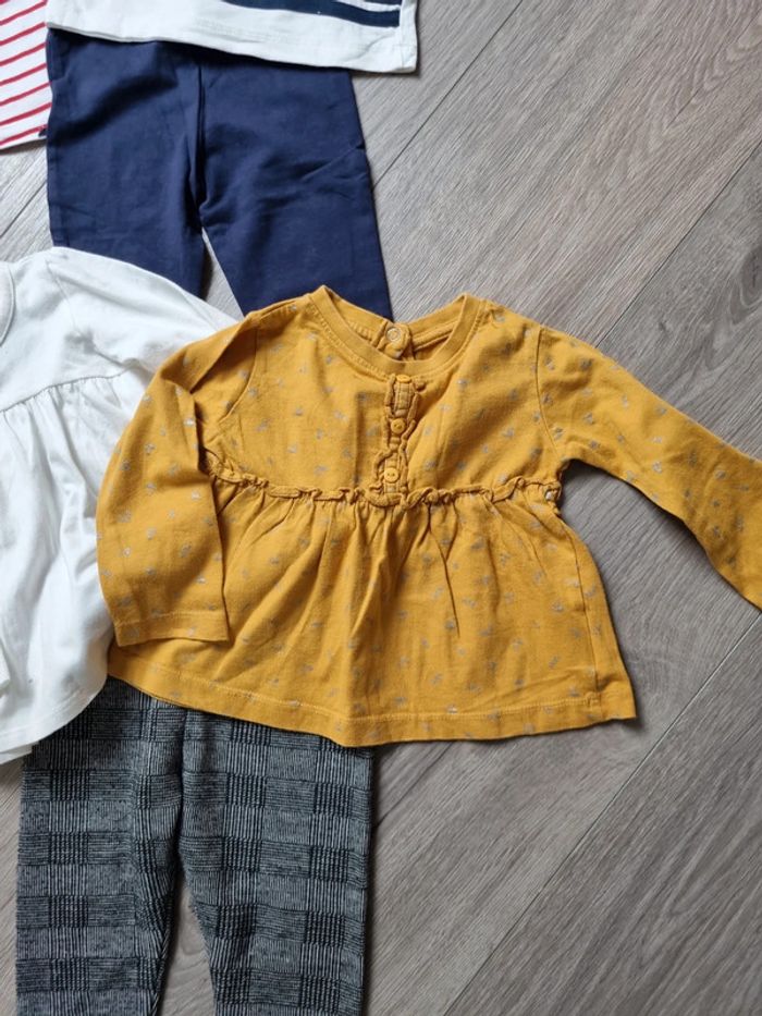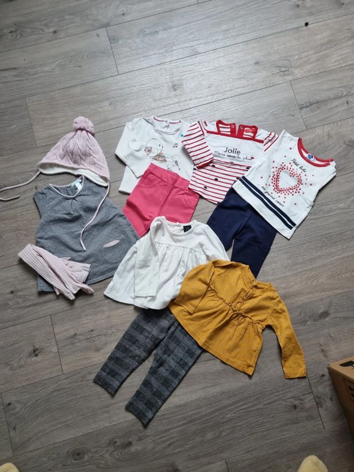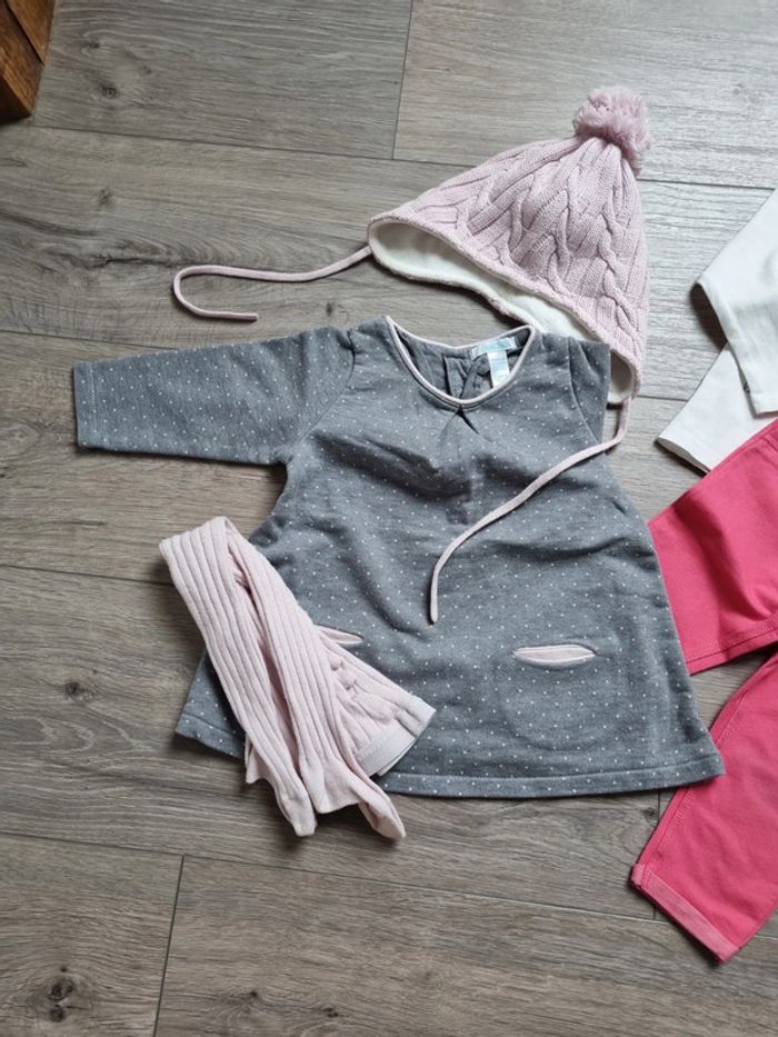 deux chemise à volant en TBE : une blanche et une moutarde un leeging épais gris kiabi en TBE 18mois mais 77/82 cm une robe avec bonnet et collant assortis : TBE 3 Tee-shirt manches longues en Bon état (qq taches au manches pour un des Tee-shirt) + un leeging marine et un jegging rose